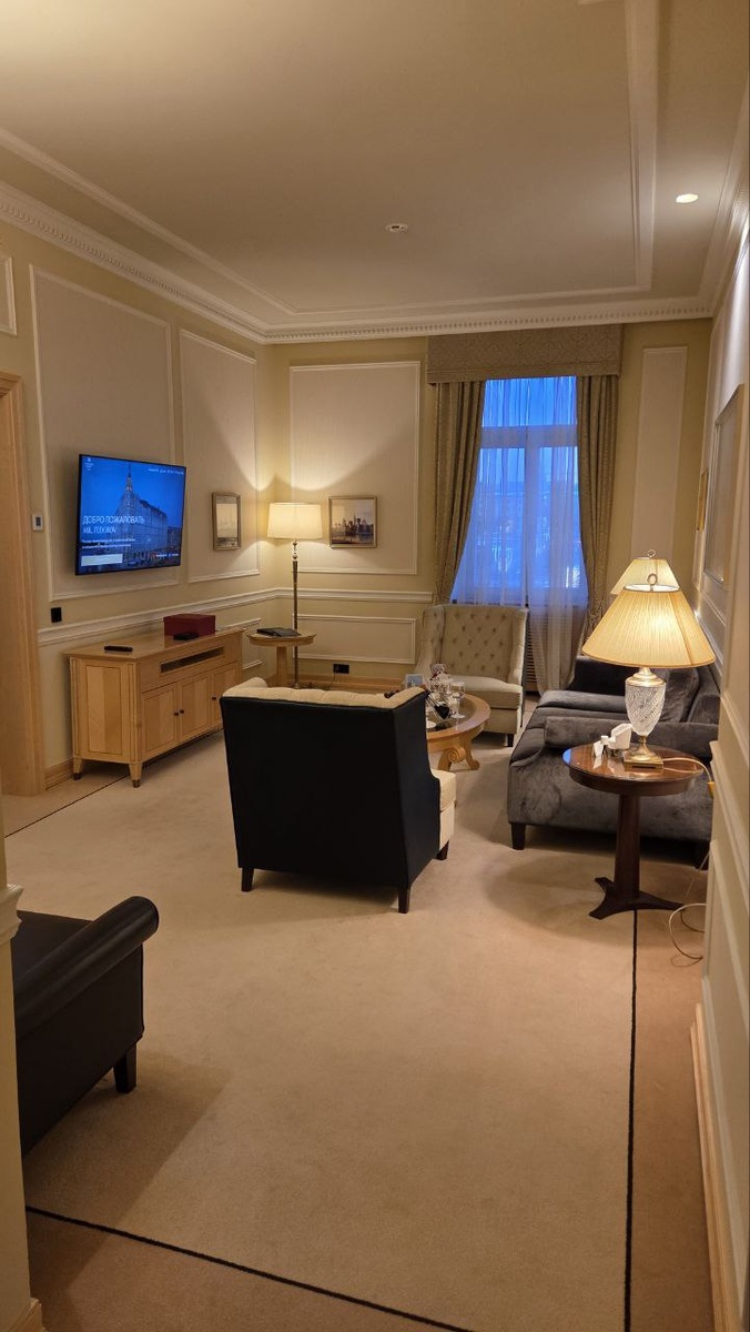 Бархатные диваны, мягкие кресла, хрустальные лампы – короче, «тихая роскошь», как и должно быть – дорого-богато-скромно. Под репродукцией гравюры с Царь-колоколом чайно-кофейная станция, тут же бутылочка просекко с QR-кодом на мини-бар, который располагается снизу. Ну, а там конечно есть всё для дорогих господ – от розе до пива, от Белуги до Тундры) #baltschug