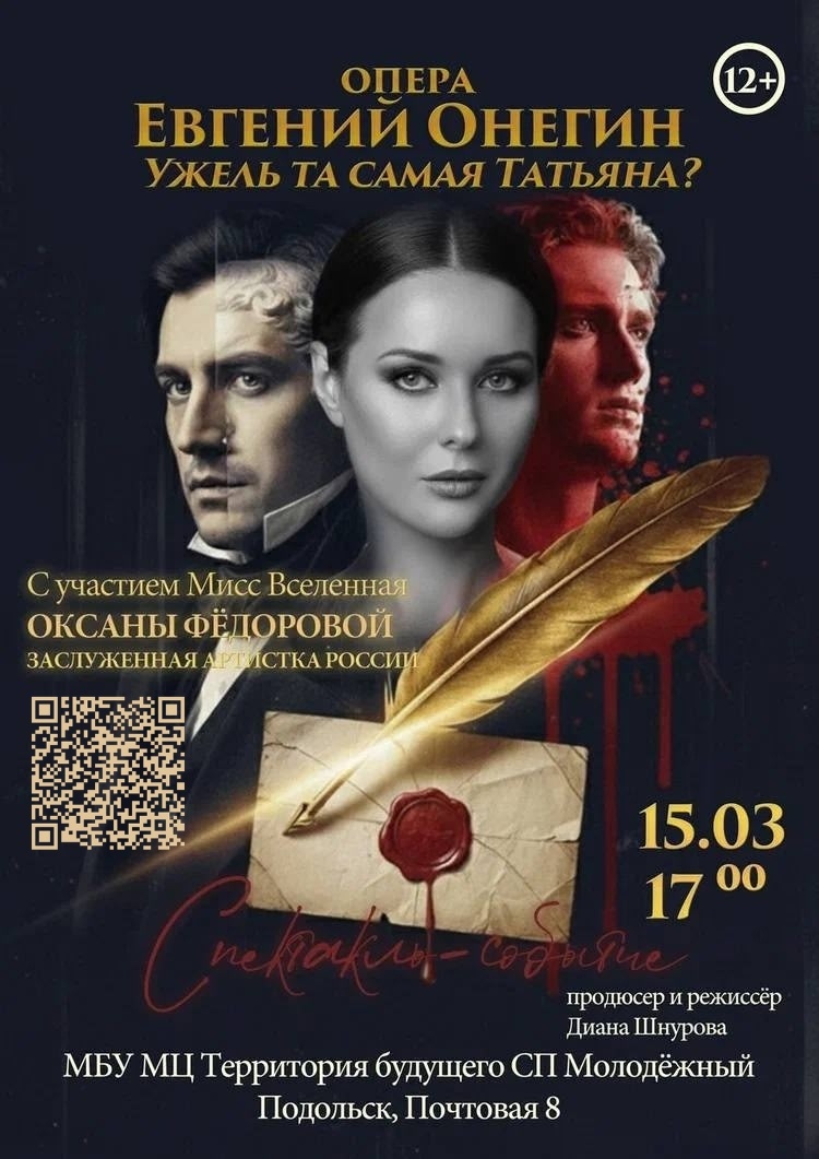 Этот спектакль научит видеть сердцем. Это постановка, которая ломает стереотипы и соединяет два мира — зрячих и незрячих — в единое пронзительное искусство. В одной из главных ролей – блистательная Оксана Федорова. Организатор - АНО «Центр развития социокультурных инициатив «ПроСвет» при участии Благотворительного фонда Оксаны Федоровой. «Евгений Онегин» — это со школы всем известная история. И мы привыкли видеть в этом сюжете лишь любовную драму. Но опера «Ужель та самая Татьяна» открывает другой слой — мистический и философский. Здесь сталкиваются два мира: надмирная поэзия и жесткая материя. Татьяна здесь — не просто влюбленная девушка, а воплощение Музы. Она испытывает героев. Онегин проваливает этот экзамен: убив Ленского, он уничтожает поэзию в самом себе. А тот, кто пуст душевно, не достоин быть рядом с Музой. Почему этот спектакль нельзя пропустить? Это редкий пример инклюзивного искусства высочайшего уровня. На одной сцене создают магию солисты Большого театра и талантливейшие