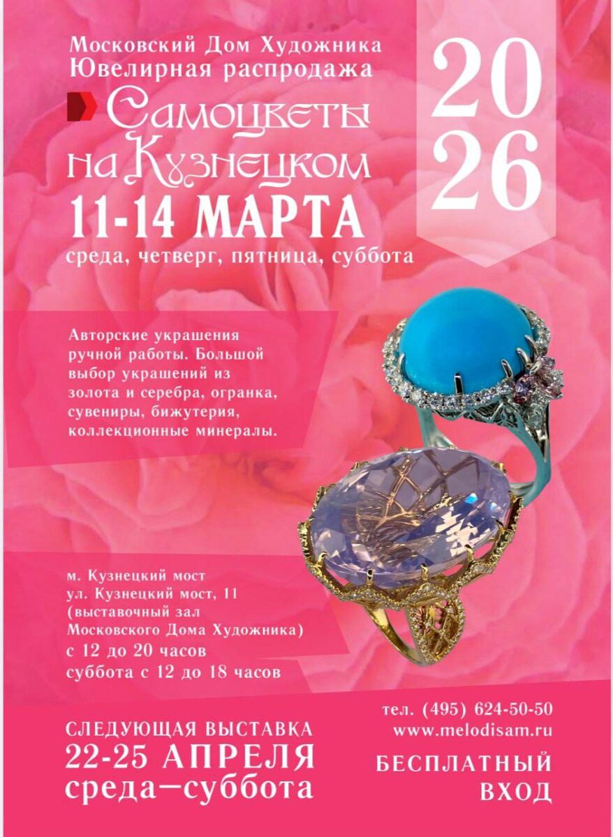 ! Дорогие друзья и ценители прекрасного! С 11 по 14 марта в Москве пройдёт выставка «Самоцветы на Кузнецком» — долгожданное событие в мире камня и ювелирного искусства. 📍 Место проведения: Московский дом художника (ул. Кузнецкий Мост, 11). 🚇 Ближайшее метро: Кузнецкий мост. 🕛 Режим работы: · 11–13 марта (среда–пятница): с 12:00 до 20:00 · 14 марта (суббота, заключительный день): с 12:00 до 18:00 Это отличная возможность увидеть уникальные работы мастеров, вдохновиться красотой самоцветов и найти что-то особенное для себя или в подарок. Приходите за эстетическим удовольствием и открытиями! Ждем вас! 💎 #СамоцветыНаКузнецком #ВыставкаВМоскве #ЮвелирнаяВыставка #МосковскийДомХудожника #КузнецкийМост #Минералы #Ярмарка #Март2026