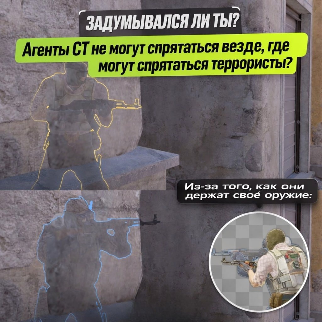 Как агенты держат оружие, влияет на то, сколько места нужно за укрытием. Из-за стойки оружия CT-агентам нужно немного больше пространства, чтобы полностью спрятаться за укрытием, чем T-агентам. Знали об этом? 👍 Esports.ru | CS