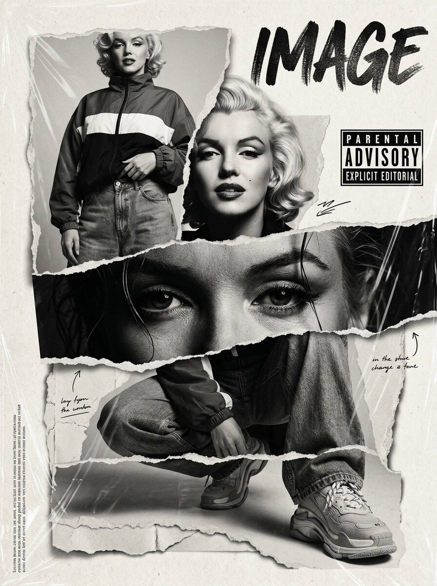 ! 1. Открываем Nano Banana Pro в Head Ai 2. Загружаем фотографию 3. Вставляем промт Вертикальный постер в формате 9:16, дизайн в стиле высококонтрастного чёрно-белого коллажа, современная гранж-эстетика модного editorial. Фон — текстурированная бумага off-white с заметным зерном и мягкой глубиной теней. Несколько рваных бумажных слоёв, которые открывают разные фрагменты портрета. Главный герой: моё лицо должно быть сохранено максимально точно. Верхний рваный слой: чёрно-белый фэшн-кадр по пояс. На мне оверсайз streetwear-куртка с широкой белой полосой поперёк груди, свободные джинсы. Непринуждённая поза, рука у пояса, урбан-настроение. Средний разрыв: экстремальный крупный план глаз, взгляд прямо в камеру. Драматичный свет, высокий контраст, очень чёткая текстура, несколько слегка влажных прядей волос падают вперёд. Нижний слой: кадр снизу — широкие джинсы и массивные кроссовки, ощущение силы и доминирования в стиле streetwear. Графические элементы: – крупное рукописное слово “