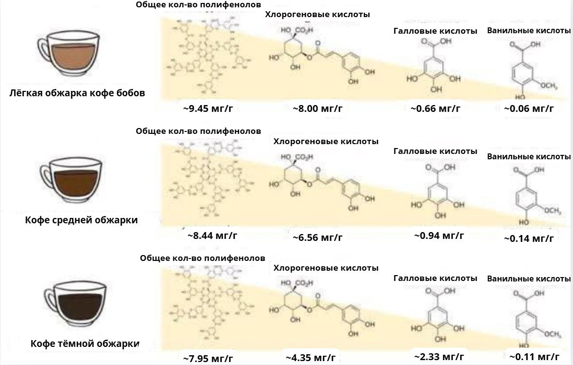 Учитывая, насколько полезно кофе для долголетия, неплохо бы знать, как получить из этого напитка максимум. И да, вопреки частым заблуждениям, у нас есть не только ассоциации. ↗️ кофе 4 недели подряд уменьшает повреждение ДНК ↘️ снижает аритмию (Да, именно так, тут нет опечатки.) ↗️ прокачивает функцию сосудов ↗️ улучшает чувствительность к инсулину ...и так далее до бесконечности. В общем, речь не только про размытую связь между употреблением кофе и продолжительностью жизни. Есть серьёзные причины думать, что дело именно в кофе. Однако, откуда столько пользы? Главным образом, от полифенолов. И, конечно, полифенолов может быть больше или меньше, и, как следствие, пользы. Органический кофе, хранившийся минимальное количество времени в идеальных условиях, понятное дело, будет содержать больше. Однако, что на счёт метода обжарки? На иллюстрации прикрепляю результаты: чем темнее обжарка, тем меньше полифенолов, и особенно хлорогеновых кислот, которые и оказывают влияние на липидный профиль,