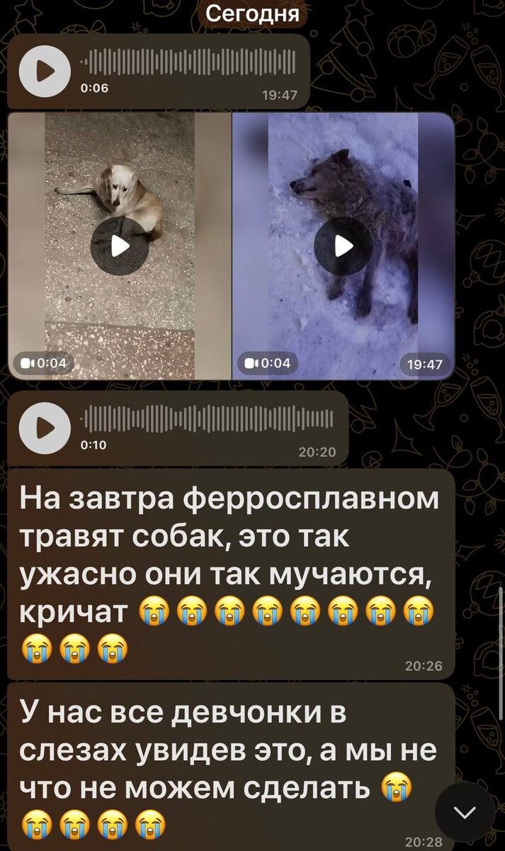 😰 ТРАГЕДИЯ всё-таки произошла…….. ЧЕРНАЯ СРЕДА 11 марта….. Сообщение, которое вышибило из колеи……. Скрин…видео даже открывать не стала и не стану… дичь…шок… Женщины! Работники ферросплавного завода! Вы понимаете, что их жизнь только в Ваших руках?! Вы можете объединиться и сходить к руководству, составить план действий, чтоб подобного фашизма не происходило?! Нет безвыходных ситуаций! Вы видите! Вы плачете! А ТОЛКУ? Вы сообщаете, что подобное происходит из года в год! Сколько этот ад будет происходить еще?! Понятно, вы боитесь потерять работу. Я не призываю Вас рвать тельняшку на груди, я призываю вас решить вопрос цивилизованным путем!! Понятно, что травили не на камеру и нет доказательств - не привлечь виновного. Но! Вы молчите - и ЭТО ПРОИСХОДИТ У ВАС НА ГЛАЗАХ ИЗ ГОДА В ГОД! Почему они должны погибать в муках? Кто за них заступится?!
