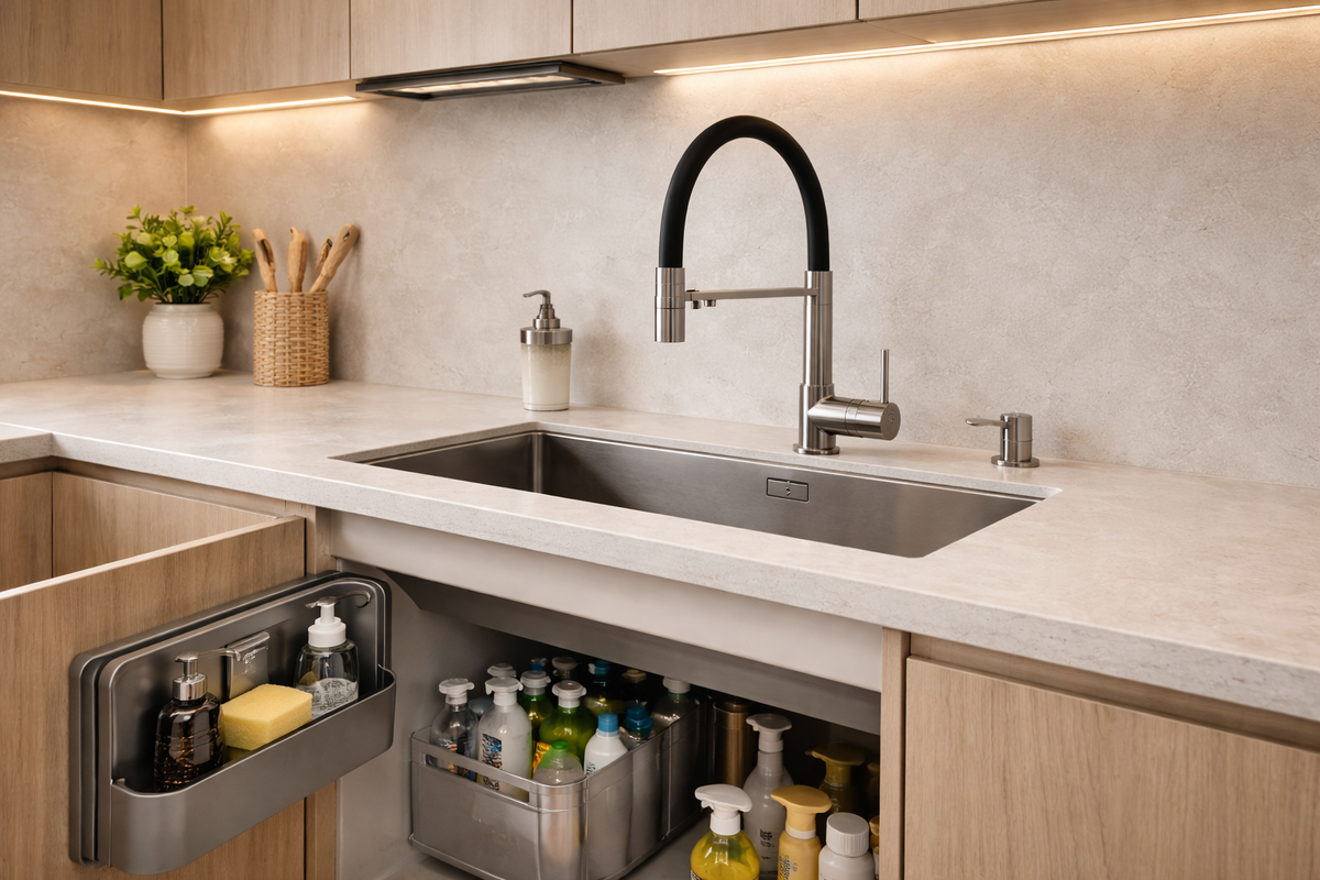 Если кухня выглядит дорогой, почти всегда дело не в «брендах на фасадах», а в том, как собрана зона воды: мойка, смеситель, столешница, свет и мелкие детали. Это место вы видите чаще всего — и оно же чаще всего раздражает, если сделано неправильно. Ниже — 10 профессиональных решений, которые дают эффект «как в проекте» и при этом реально удобны в быту. Главный тест: струя должна попадать в центр чаши, а не в кромку. Для камня/кварца/керамогранита подстольная мойка даёт два эффекта: Важно: для ЛДСП подстольный вариант рискованнее из-за влаги в кромке — там лучше качественная врезка и герметизация. Слив, смещённый к задней стенке или в бок, освобождает центр чаши и «подмойку»: Гофра — чемпион по запахам и жирному налёту.