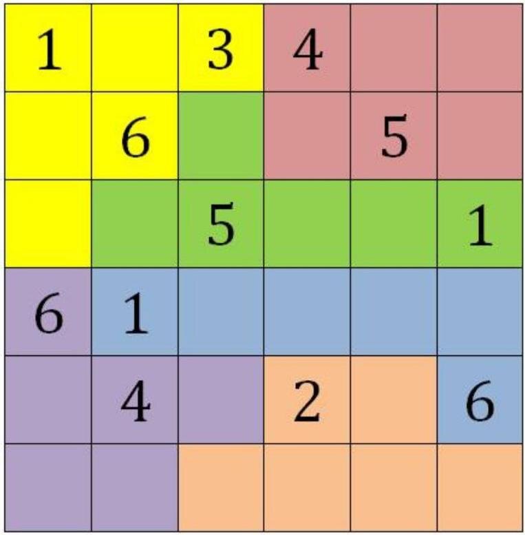 Почти обычный кроссворд судоку. Но! Числа не должны повторяться в строках, столбцах и цветных областях)) Не так просто как кажется. После заполнения судоку и самопроверки полезно попросить кого-то вас перепроверить)) Поделитесь потом легко ли было?)
