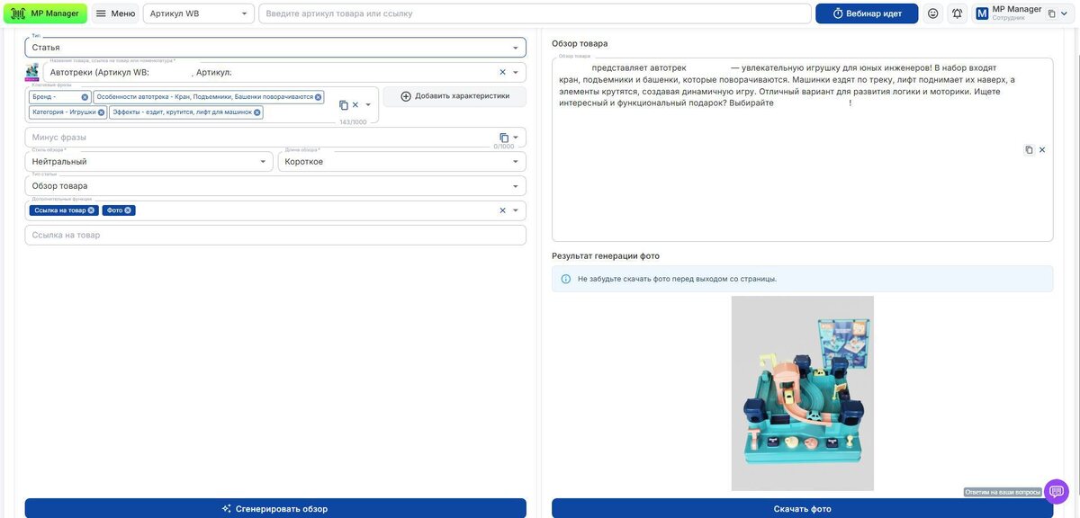 Инструмент генерации в MP Manager помогает закрывать сразу несколько задач: от описаний для карточек и генерации фото до статей, постов и сценариев к видео в одном интерфейсе, без лишних переключений и ручной работы. 🔹 Выбор типа текста под задачу В строке «Тип» можно выбрать формат, под который будет строиться логика генерации: 1️⃣ Описание Подходит для карточек товара. Вы можете: – прописать свои ключевые фразы – или выбрать готовые характеристики (бренд, категория, цвет, комплектация и др.) ✔️ На выходе – структурированное, логичное описание, адаптированное под товар и нишу. 2️⃣ Статья Формат для продвижения и контента. Доступен выбор типа статьи: – реклама – пост в соцсети – обзор товара Дополнительно можно подключить функции: – ссылка на товар – фото (генерируется сразу по описанию на этой же странице) – призыв к покупке – ссылка на соцсети ✔️ Удобно, когда нужно быстро подготовить готовый материал под публикацию. 3️⃣ Общие Формат для креатива и видео. Доступные типы текс