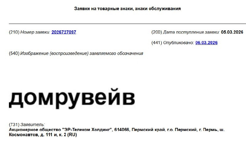 Компания «Эр-Телеком Холдинг» подала три заявки на товарный знак «ДомруВейв» в различном оформлении. Ознакомиться с ними можно здесь, здесь и здесь. Заявки поступили в Роспатент 5 марта. В перечне товаров и услуг, которые хочет защитить исключительным правом заявитель, фигурируют блоки памяти для компьютеров, мониторы, различные носители информации, операционные программы, процессоры, сканеры, коммутационные устройства и тому подобное. Согласно информации из открытых источников, «ДомруWave» — это линейка современных двухдиапазонных Wi-Fi 6 роутеров (AX1500, Wave Plus, Mesh Wave Plus), обеспечивающих скорость до 1 Гбит/с, покрытие до 200 кв. м и подключение до 100 устройств. Они созданы для стабильной работы в умном доме и управляются через приложение «Мой Дом.ру». Справка: • АО «Эр-Телеком Холдинг» зарегистрировано в 2006 году в Перми и специализируется на деятельности в области связи на базе проводных технологий. В 2024 году компания, которая работает под брендом «Дом.ру», отчитал
