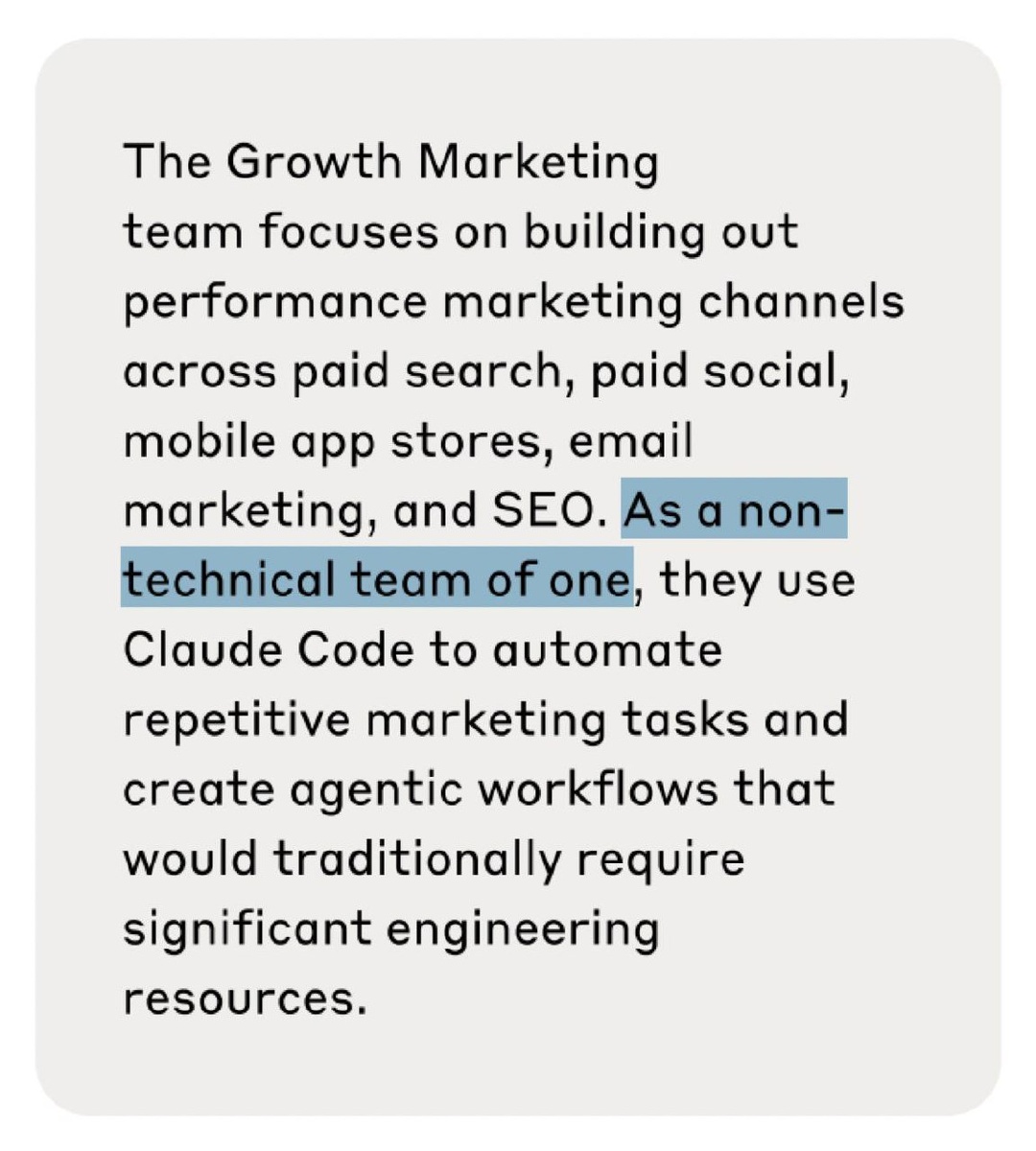 Почти год в отделе growth-маркетинга Anthropic работал один сотрудник. Его задачи включали создание рекламных постов для соцсетей, email-рассылки и SEO. В работе ему помогал только Claude. Анализ объявлений проводился через выгрузку CSV-файлов из рекламных платформ, которые затем обрабатывал Claude. Все процессы — от написания текстов до создания визуального контента — были автоматизированы. Один человек выполнял задачи целой маркетинговой команды за 15 минут. https://dzen.ru/id/5c0e38ff46ef5c00aaa80527