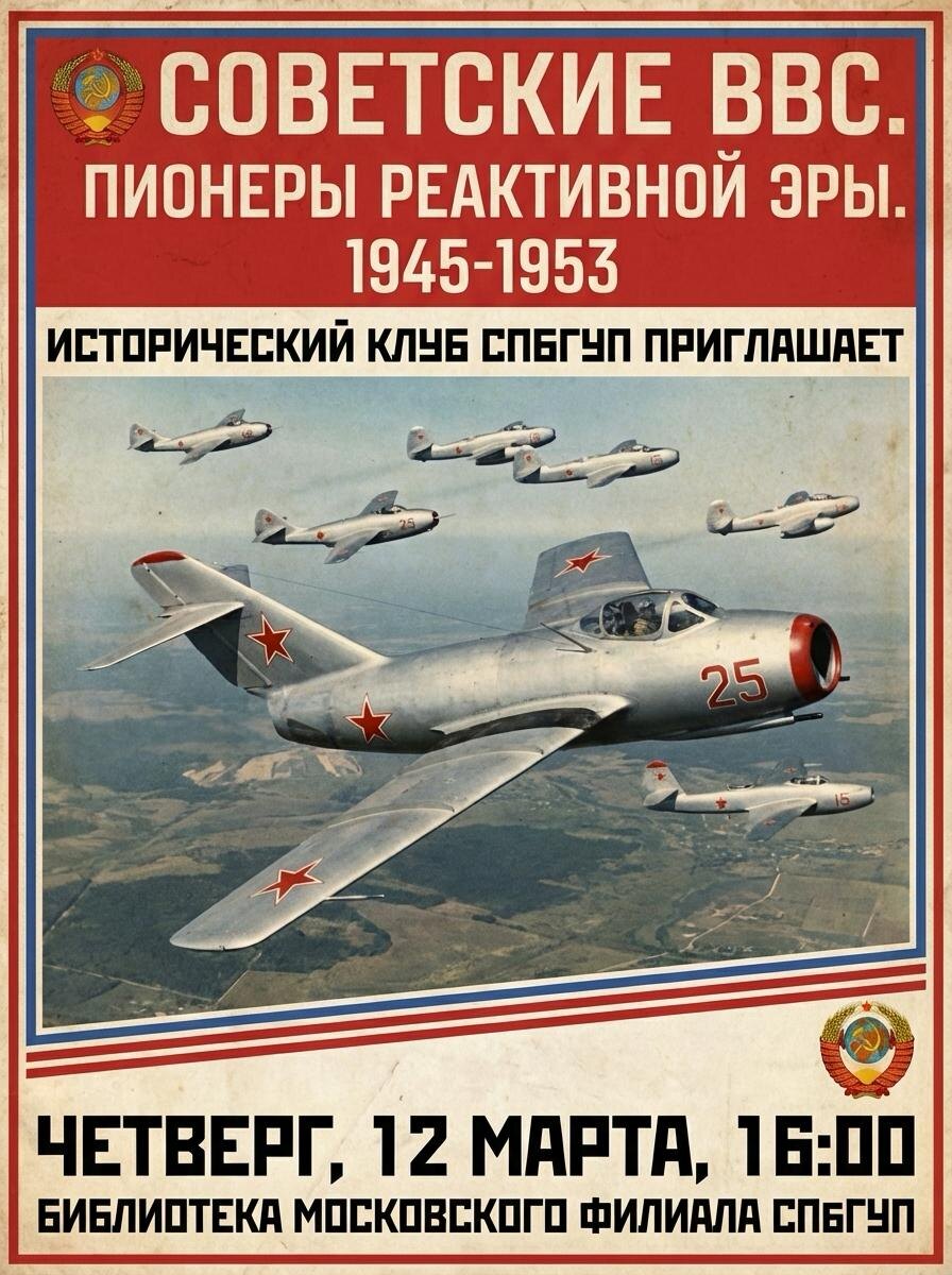 ✈ Всем привет, друзья! В этот четверг 12 марта в 16:00 в библиотеке СПбГУП Московский филиал, состоится очередное заседание Клуба военной истории. Юрченко А. Л. выступит с докладом "Советские ВВС. Первенцы реактивной эпохи. 1945-1953гг." Сайты: msk-gup.ru и msk.gup.ru ВК сообщество: vk.com/inisk Яндекс Дзен: dzen.ru/spbgup ТГ канал: https://dzen.ru/id/6537d0070d3ed760fbd1986c #Зеленоград #Менделеево #СПбГУП #ИИиИТ #Институт #Университет #Химки #Клин #Солнечногорск #ЗелАО #Профсоюзы #МФП