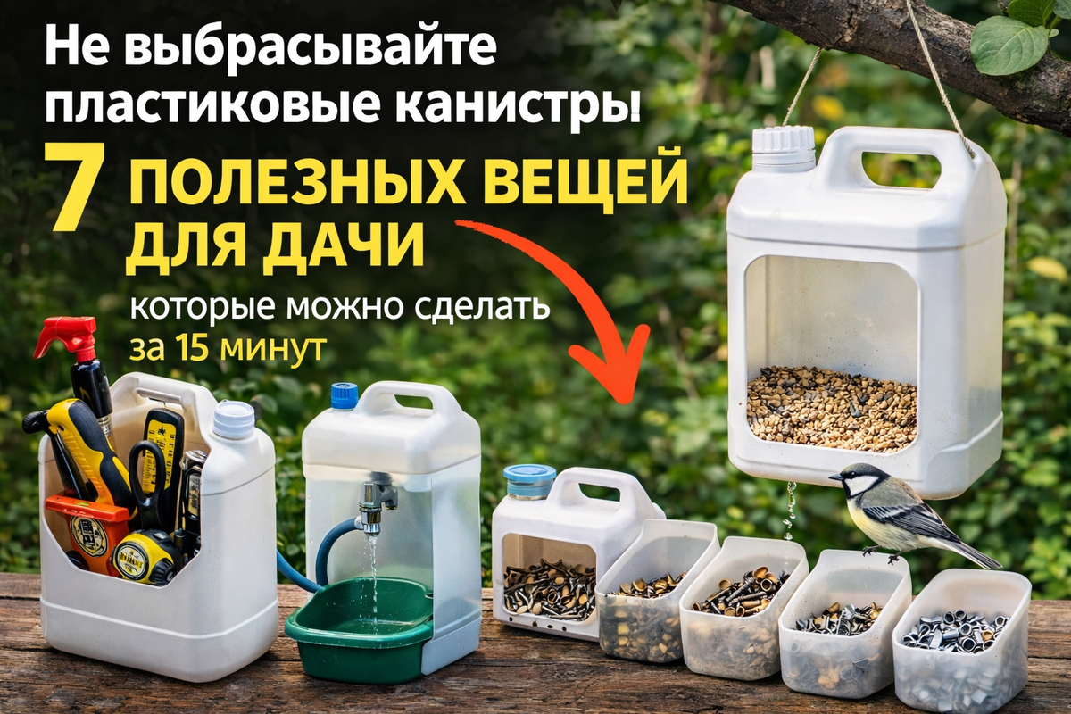 А зря. На даче и в мастерской они могут превратиться в очень полезные вещи, которые стоят денег в магазине. Я собрал несколько простых идей, которые можно сделать буквально за 10–20 минут. Самая популярная переделка. Что делают: Сверху заливают воду — и получается удобный уличный умывальник. Такой часто ставят: Из канистры можно сделать простой опрыскиватель. Что нужно: В крышку устанавливают распылитель, внутрь заливают раствор. Получается большой опрыскиватель для обработки растений. Очень удобная вещь для мастерской. Канистру разрезают сбоку, оставляя ручку сверху. Получается контейнер, в который удобно складывать: Такие органайзеры удобно переносить по участку. Из канистры получается хорошая кормушка. Что делают: Птицы быстро находят такую кормушку, а пластик не боится дождя и снега. Если разрезать канистру на несколько частей, получится удобный контейнер. В них можно хранить: Особенно удобно, что ручка уже есть — контейнер лег