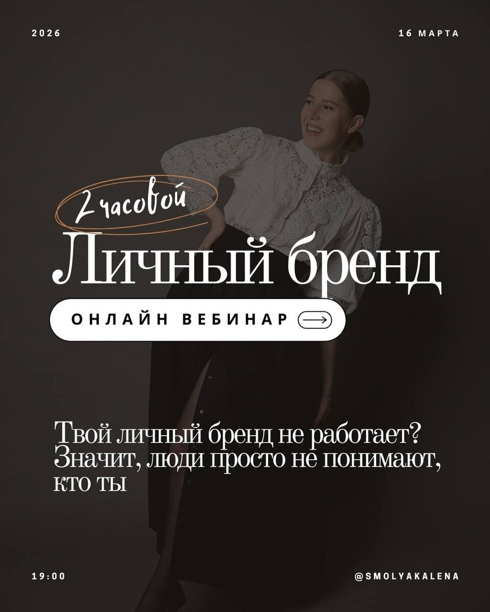 — он просто листает дальше. Личный бренд — это не только про “красивый логотип и цвета”. Это то, что о тебе говорят, когда ты вышла из комнаты: репутация, образ, доверие. 16 марта в 19:00 я проведу двухчасовой вебинар по личному бренду. За один вечер мы: 1. распакуем твой опыт: факты, смыслы, уникальность, откуда вообще растёт твой личный бренд; 2. посмотрим на профиль глазами клиента и проведём аудит «что есть / что должно быть» (шапка, первые 9 постов, актуальные, визуал); 3. соберём понятную формулу «кто ты, для кого ты и какой результат даёшь»; 4. наметим 3 шага, как начать транслировать себя в мир без ощущения «я выпендриваюсь». Каждый участник получит чек‑лист по личному бренду: с вопросами для распаковки и списком критериев для аудита профиля, чтобы ты могла возвращаться к нему снова и снова. Когда: 16 марта, 19:00 (МСК), онлайн Стоимость: 990 ₽ Запись будет, но в прямом эфире я могу разобрать ваши вопросы. Если после вебинара ты поймёшь, что нужен более глубокий личный