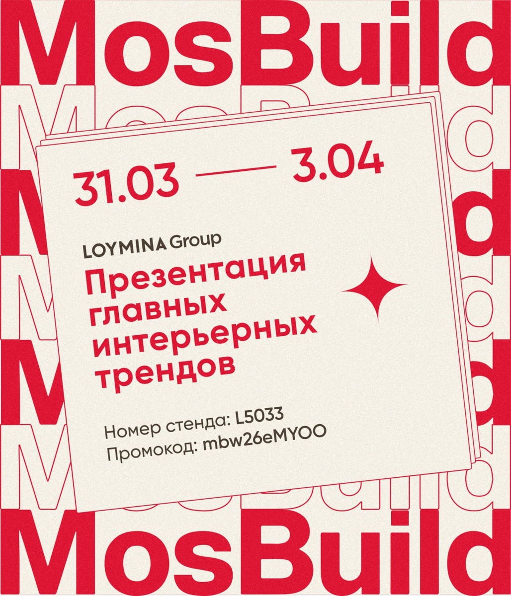 С 31 марта по 3 апреля в МВЦ «Крокус Экспо» пройдёт MosBuild 2026 — крупнейшая выставка в сфере дизайна интерьеров. И у нас есть повод встретиться там. На стенде LOYMINA Group состоится несколько важных премьер: ✔️ презентация нового типа настенных покрытий ✔️ новые коллекции обоев и панно ✔️ обзор интерьерных трендов от креативного директора Наталии Блазкез ✔️ интерактивная мудборд-зона, где дизайнеры смогут поработать с новыми материалами У нас есть промокод на бесплатный билет — mbw26eMYOO. Используйте его при регистрации на сайте: https://mosbuild.com/ru/visit/get-e-ticket/ 31 марта — 3 апреля МВЦ «Крокус Экспо» Павильон 3, зал 14, стенд L5033 Кто планирует быть на MosBuild? С кем увидимся?