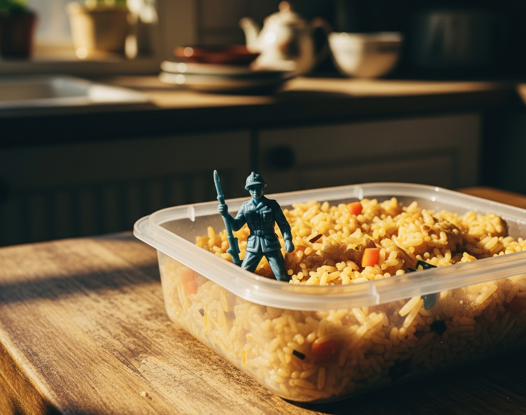 Я присмотрелась. На дне контейнера, среди риса, лежал маленький, явно детский, пластмассовый солдатик. Синий. Я взяла его пальцами. Он был липкий от масла.