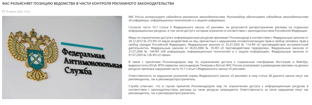 5 марта 2026 года ФАС подтвердила: раз Роскомнадзор применяет к Telegram меры по ограничению доступа — реклама на платформе незаконна.