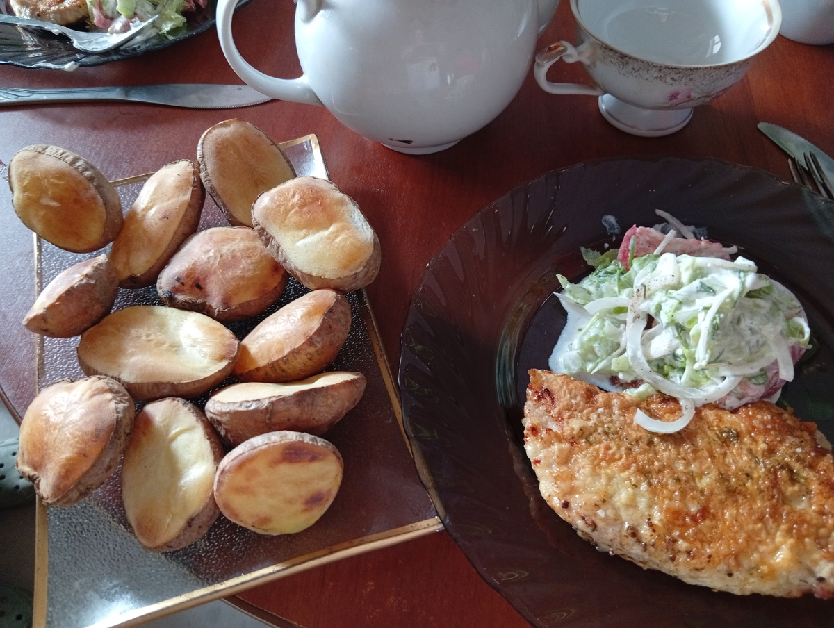 Отдельно запечь на фольге в духовке картошку. 🥔