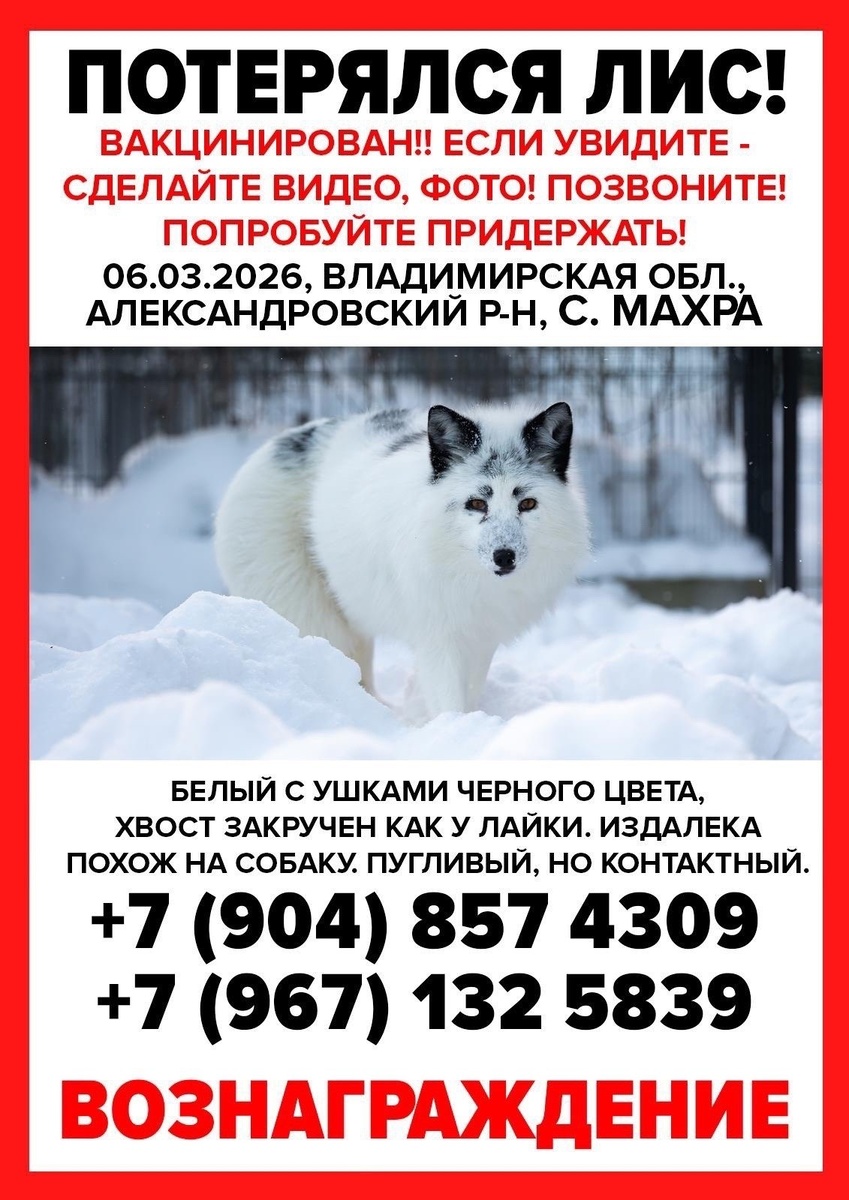 В Александровском округе ищут арктического мраморного лиса по кличке Марвэл. Он сбежал из приюта для животных на территории Свято-Троицкого Стефано-Махрищского женского монастыря. Марвэл привит и не агрессивен, но в дикой природе никогда не жил — ему нужна помощь людей. Если вы увидите лиса — не пытайтесь ловить его сами, а сразу сообщите сотрудникам приюта. За помощь в поимке объявлено вознаграждение. Написать нам: @alexlivebot Подпишитесь на –@alexautolive Канал в MAX – max.ru/alexautolive