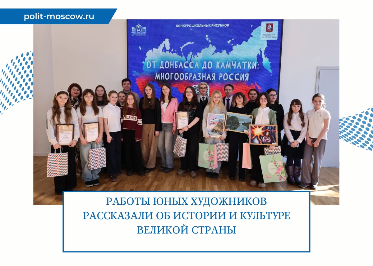 Выставку картин «От Донбасса до Камчатки: многообразная Россия», приуроченную к Году единства народов России, а также Дню воссоединения Крыма с Россией, составили работы школьников из четырех районов Северного административного округа столицы. Экспозицию в районном центре «Место встречи Нева» открыла ее организатор – депутат Московской городской Думы Милена Авимская. Милена Авимская напомнила, что в России при всем многообразии языков, культур, традиций с уважением относятся к каждому этносу. А объединяющим для всех является русский язык и понимание, что все мы живем в одной стране. «Я посмотрел очень много работ, и все они замечательные! Юные художники из районов Головинский, Левобережный, Ховрино и Западное Дегунино представили работы, отражающие многообразие культур и единство более 190 народов, живущих в нашей стране. Выставка объединила 20 лучших работ, отобранных конкурсной комиссией из более чем трех тысяч участников онлайн-конкурса», – поделился впечатлениями член жюри конкурса