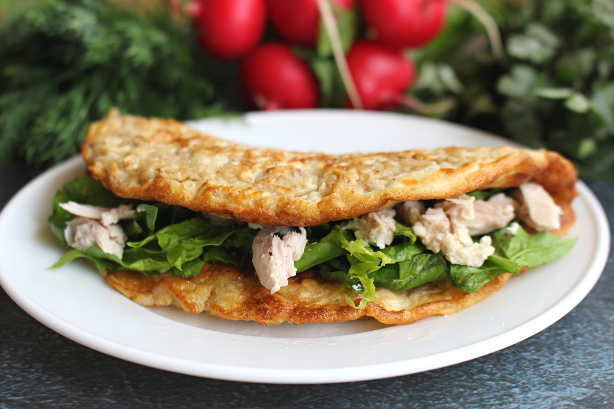 Овсяноблины часто используют в здоровом питании, они подходят для сытного завтрака или перекуса в течение дня. Овсяноблины замечательно сочетаются с разными начинками. Их можно подавать с фруктами, ягодами, мёдом, йогуртом или творогом, а также можно использовать несладкие варианты: овощи, мясо, сыр, зелень. Предлагаю приготовить весенний овсяноблин с самой простой начинкой. Если вам хочется, то этот овсяноблин можно смазать майонезом, любимым соусом, сметаной, на ваш выбор. Такой блин можно готовить на сливочном масле. Овсяные хлопья - 30 г. Молоко - 30 мл. Яйцо куриное - 1 шт. Соль, перец черный молотый - по вкусу Масло растительное для жарки - 0.5 ч.л. Начинка: Куриная грудка вареная - 80 г. Шпинат свежий - 15-20 г. Хлопья выложим в чашку, зальем молоком, перемешаем и оставим минут на 10. Вбиваем в чашку яйцо, добавим соль, черный молотый перец и перемешиваем. На сковороде разогреем масло и выложим овсяную массу. Готовим блин на небольшом огне, под крышкой, до румяного низа. Перевор
