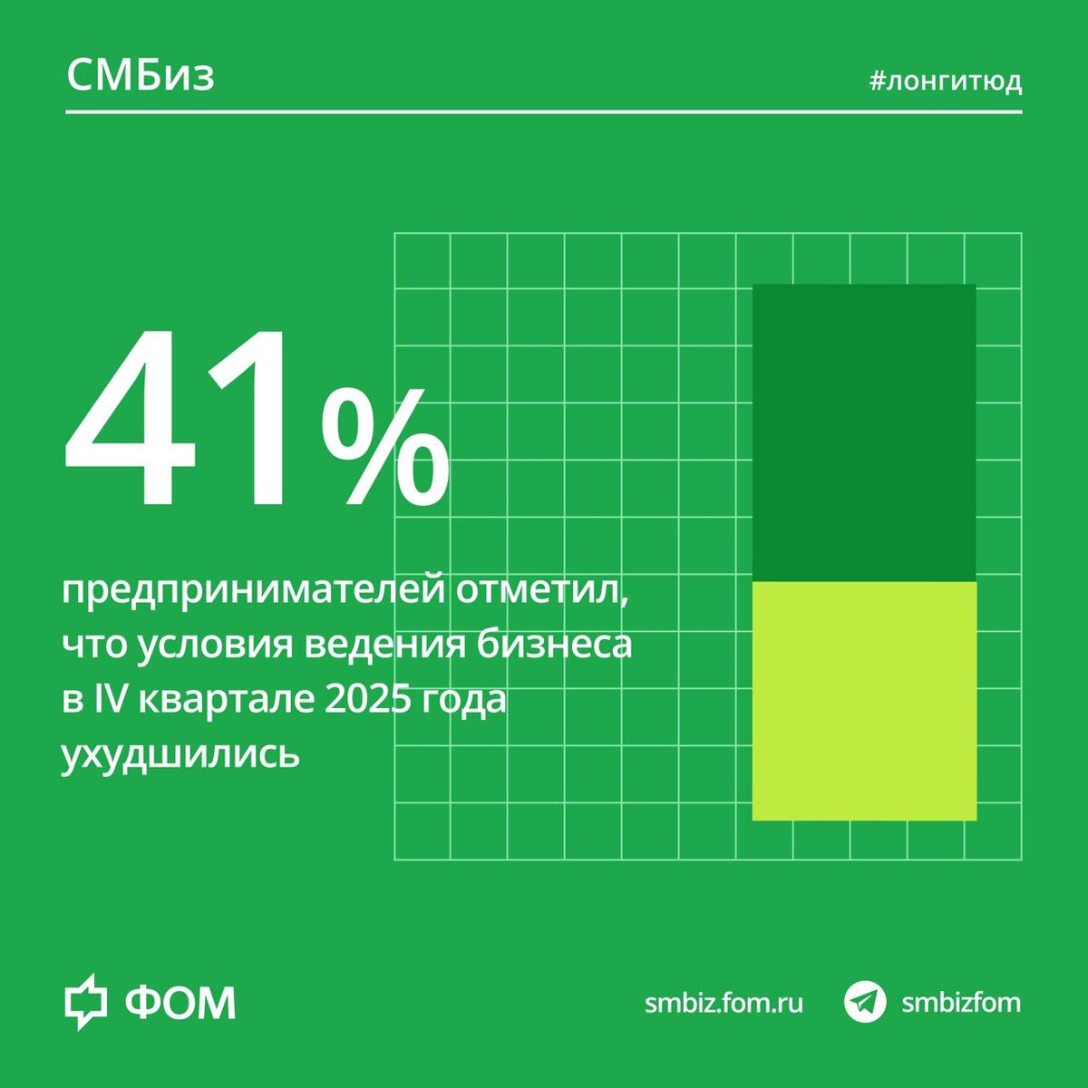 По оценкам аналитиков ФОМа, IV квартал 2025 года характеризовался снижением ряда ключевых показателей малого бизнеса: участники Лонгитюда сообщили о снижении доходов, покупательского спроса и ухудшении условий для ведения бизнеса. Все больше компаний стало придерживаться стратегии выживания. На фоне этого произошло ухудшение настроений предпринимателей – выросли тревога и беспокойство, а оптимизма и уверенности в будущем стало меньше. Подробнее: Негативная динамика показателей бизнеса и пессимистичные настроения предпринимателей ______________________________ 📎 Хаб СМБиз: открытые данные Лонгитюда Малого Бизнеса ______________________________ #бизнес #СоциологияМалогоБизнеса 📱 Фонд Общественное Мнение