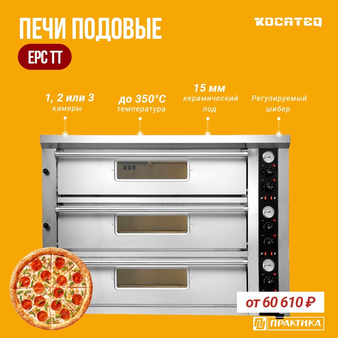 Вместе со статическими печами склад поступили подовые печи для пиццы KOCATEQ EPC TT. Эти модели подойдут для пиццерий, кафе, фуд-кортов и небольших производств, где важно быстро и стабильно выпекать пиццу с хорошо пропечённым основанием. Керамический под аккумулирует тепло и помогает получить хрустящую корочку, а раздельная регулировка верхнего и нижнего нагрева позволяет точно настроить режим выпечки под разные виды пиццы. ◽️1, 2 или 3 камеры ◽️Размер пода 69,2*68 см, 69,2*100 см, 69,2*133 см ◽️Керамический под толщиной 15 мм ◽️Аналоговая панель управления ◽️Термостаты для установки температуры в зоне верхних и нижних ТЭНов до 350°C ◽️Термометр ◽️Подсветка ◽️Фронтальная часть и дверь изготовлены из нержавеющей стали, боковые панели и верх из эмалированной стали черного цвета ◽️Регулируемый шибер открытый/закрытый 🔘 от 60 610 ₽* *Цены актуальны на момент опубликования https://pectopah.ru/catalog/?q=EPC+TT ◽️pectopah.ru ◽️zakaz@pectopah.ru ◽️Мы в МАХ ◽️+7 (495) 921-39-86 🤓 Подпи
