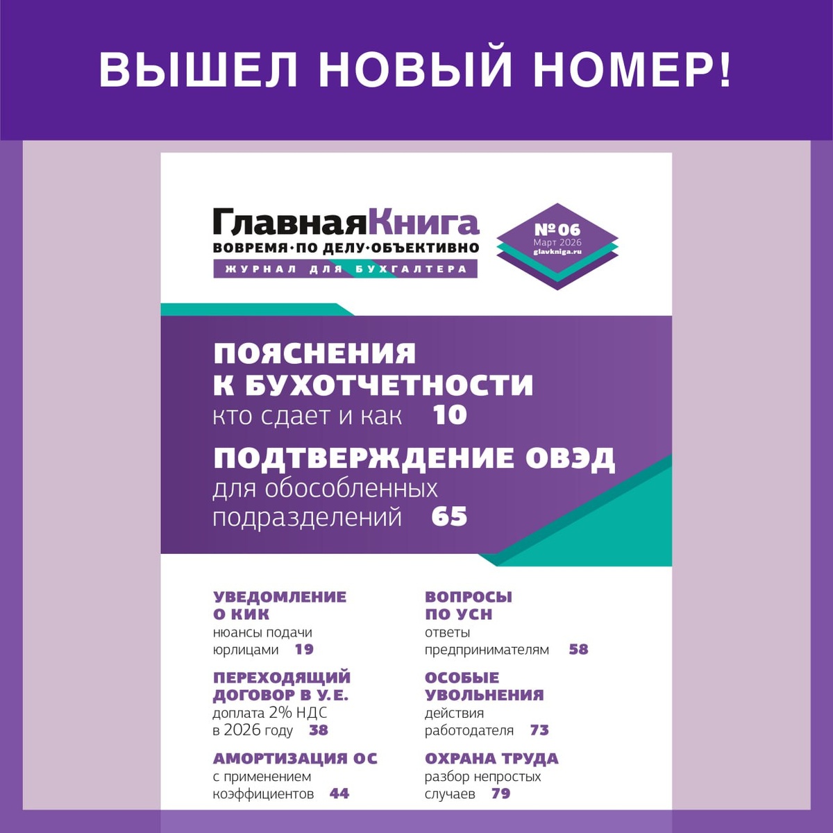 📝 Пояснения к бухотчетности, формы и не только 📝 ПОВЭД-2026: теперь только для обособленных подразделений организации 📝 Уведомление о КИК-2026: особенности подачи юрлицами 📝 Применение коэффициентов к норме амортизации ОС в налоговом учете 📝 Какие УСН-вопросы нам задавали ИП 📝 Упрощенный бухучет в вопросах и ответах 📝 «Прибыльный» учет затрат на покупку ОС, если фирма применяет РИНВ 📝 ПОВЭД-2026: как получить отдельный тариф для структурного подразделения организации 📝 Что делать работодателю в особых «увольнительных» ситуациях 📝 Что надо иметь в виду для правильной организации охраны труда 🔐 Чтобы прочитать статьи журнала «Главная книга», активируйте пробный доступ и в течение 2 дней знакомьтесь с публикациями журнала. Пользуйтесь всеми калькуляторами, скачивайте необходимые формы и образцы документов.
