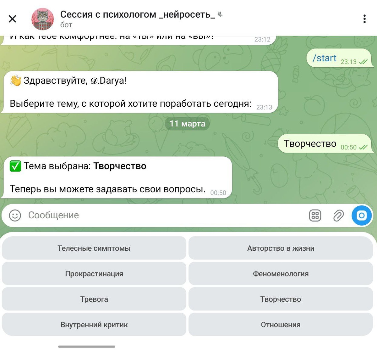 ? Не завтра, не «когда найду время записаться» — а прямо сейчас, когда что-то тревожит, давит или просто непонятно, что происходит внутри. Я создала психологического бота, потому что верю: у каждого должен быть доступ к живому психологическому контакту с собой — в любой момент, из любой точки мира, даже в 3 ночи, когда всё навалилось. А такой бот в этом поможет. Я создала психологического бота. И назвала его «Сессия с психологом» — потому что это именно то, чем он является. Не чат-бот с советами. Не тест на тип личности. А живая сессия — в формате диалога, в удобный для вас момент. Внутри — восемь направлений, с которыми я работаю в живой практике уже 17 лет: — Телесные симптомы — когда тело говорит то, что ум отказывается слышать: хроническое напряжение, панические атаки, ощущение «что-то не так» — Тревога — не как диагноз, а как сигнал. Разбираемся, о чём она, и что за ней стоит — Внутренний критик — тот голос, который никогда не доволен. Учимся с ним работать, а не воевать — Про