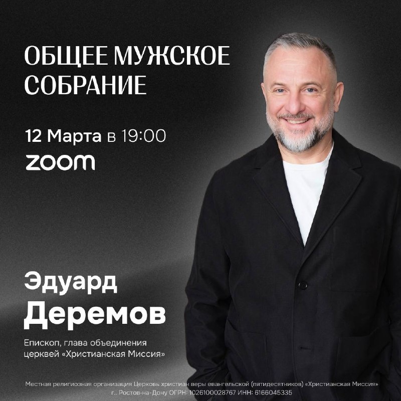 ! В четверг, 12 марта, в 19:00 Состоится общее мужское собрание на платформе Zoom для Ростова и Ростовской области, которое проведет епископ Эдуард Деремов Вы можете собираться своими сетями и домашними группами по домам, запланируйте это время!