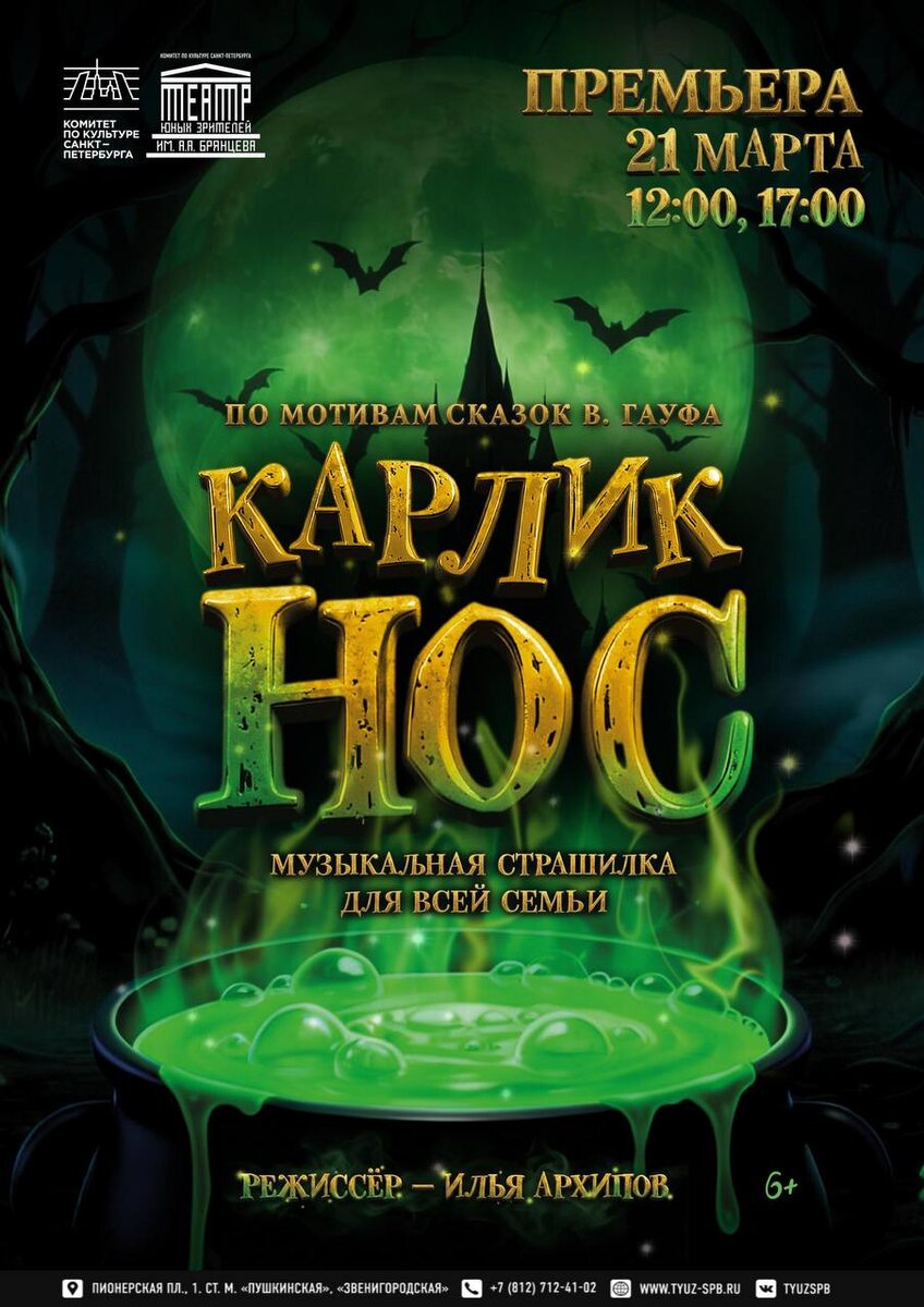 21 марта в 12:00 и 17:00 на Большой сцене ТЮЗа имени А. А. Брянцева состоится премьера музыкальной страшилки для всей семьи «Карлик Нос» в постановке лауреата Молодёжной премии Правительства Санкт-Петербурга в области культуры и искусства, лауреата Национальной премии «Музыкальное сердце театра» Ильи Архипова. Режиссёр спектакля погружается в причудливый и мудрый мир немецкого литератора Вильгельма Гауфа. В центре сюжета — судьба мальчика Якоба, превращенного в уродливого карлика злой колдуньей. Его одиночество и отчаяние смягчает лишь встреча с прекрасной заколдованной Гусыней. Вместе они отправляются в путешествие, где спасение обретает двойной смысл: чтобы расколдовать себя, нужно прежде всего спасти другого. Спектакль включает 16 оригинальных музыкальных номеров, сочетающих вокальные и хореографические партии. Музыкальная концепция спектакля построена на диалоге эпох: старинные средневековые мелодии, воссозданные по историческим манускриптам, встречаются с энергией рок-музыки. Реж