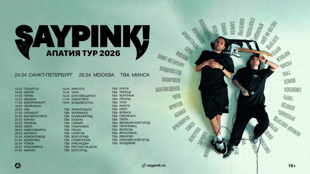 🎤 – saypink! 📍– Есть дата у 26 городов: Тольятти, Киров, Пермь, Ижевск, Екатеринбург, Челябинск, Уфа, Оренбург, Магнитогорск, Курган, Тюмень, Омск, Новосибирск, Барнаул, Новокузнецк, Кемерово, Томск, Красноярск, Абакан, Иркутск, Чита, Благовещенск, Хабаровск, Владивосток, Санкт-Петербург, Москва. Оставшаяся часть городов с афиши – концерты осенью. 🗓 – 12 марта – 26 апреля 💵 – от 2 100 руб. 🔗 – билеты (16+) #концерты #билетынаконцерт #saypink #тольятти #киров #пермь #ижевск #екатеринбург #челябинск #уфа #оренбург #магнитогорск #курган #тюмень #омск #новосибирск #барнаул #новокузнецк #кемерово #томск #красноярск #абакан #иркутск #чита #благовещенск #хабаровск #владивосток #санктпетербург #москва 👉 Список концертов: март • апрель • май @est_prohodka