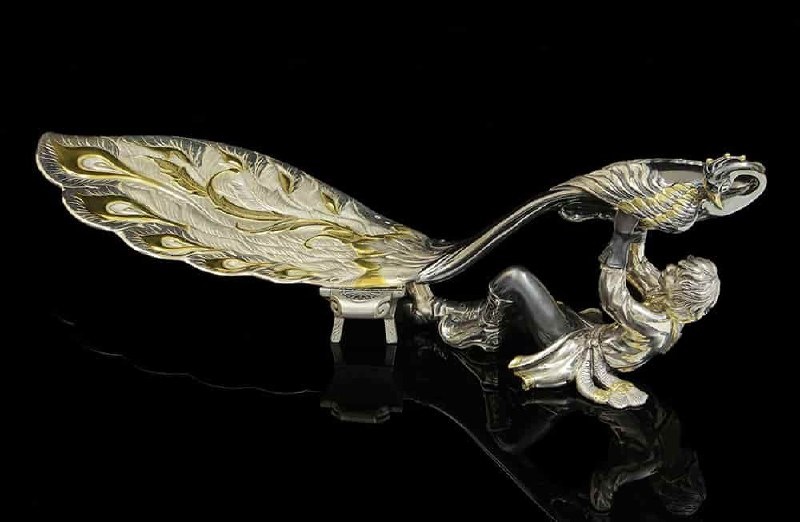 Набор для торта "Жар-птица" Художники: Бучин В.Е., Новикова Т.А., Архангельская А.Л. Технологии: Литьё, золочение, оксидирование, гравирование Материал: Серебро 925 пробы Размер (д/ш/в): 221х59х68 мм Вес изделия: 285 гр. Об изделии: Как часто бывает в жизни - маленький, невзрачный, с длинными ушами Конек-Горбунок стал для Ивана самым преданным и верным другом. В любую минуту он придет на помощь и выручит из любой беды. В русских семьях в старину было принято младших детей, не набравшихся жизненного опыта, называть дурачками. Но в те времена это не было ругательным словом. Старшие же его братья - умные были детины, поэтому поступали в жизни как велит их разум, из выгоды. А Иван по велению души и по зову сердца. Потому и с Коньком сдружились они неразлейвода. Два породистых коня - красивые да статные - могли быть лишь украшением и забавой царской конюшни. Вот и вела дорога Ивана куда сердце подскажет. Серебро...