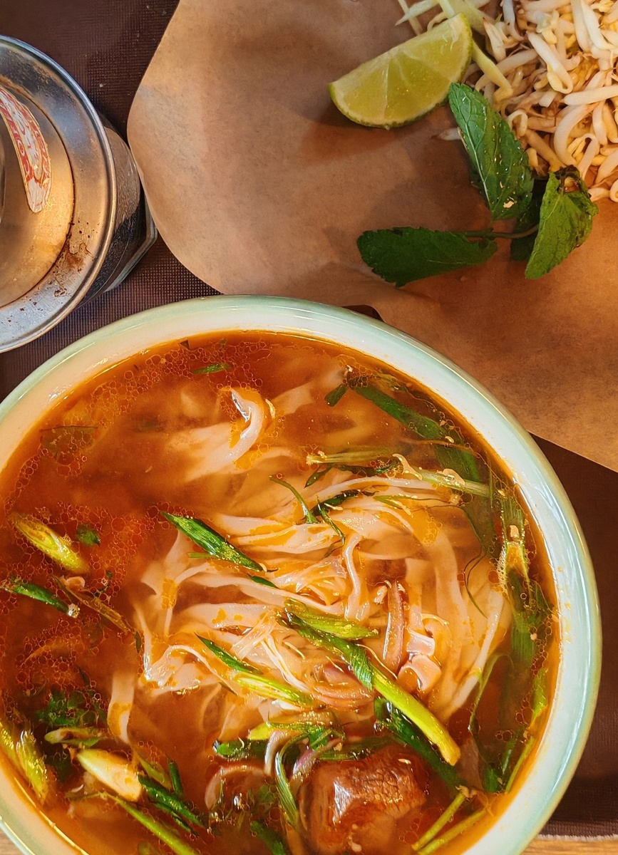 Где‑то в глубине звенит посуда на кухне, которую сначала вы не увидите, пока не пройдете полностью первый зал, тихо играет лёгкая этническая музыка из струн вышеупомянутого Дан Бау, а воздух пропитан нотами азиатской кухни довольно резко, что думаю кого-то точно может смутить, но мне лично такое смешение нравится, ведь изначально слышишь яркую и неподдельную ароматику происходящего здесь. Сердце уже ёкает от предвкушения и я наконец-то делаю заказ у вьетнамки ни черта не понимающей по-русски и если русская речь не её конёк, то вот сборка Фо меня очаровала сразу! Буквально минута, другая и вот он, Фо Бо, созданный руками этой прекрасной женщины-повара родом из Вьетнама.