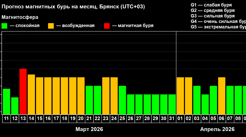 Жителей региона предупредили о возможном влиянии геомагнитных колебаний на самочувствие. Специалисты отмечают, что они могут вызывать головные боли, усталость и перепады настроения у метеозависимых людей, поэтому рекомендуется больше отдыхать и избегать сильных нагрузок. Жителей Брянской области предупредили о магнитной бури. По данным лаборатории солнечной астрономии ИКИ РАН и ИСЗФ СО РАН, её воздействие ожидается 13 марта. Событие отнесено к классу G1, что соответствует слабому уровню. Воздействие геомагнитных колебаний коснется и территории Брянщины. Специалисты отмечают, что подобные явления способны влиять на самочувствие метеозависимых людей. В частности, возможны головные боли, усталость и перепады настроения. Врачами рекомендовано в эти дни уделять больше времени отдыху. Также советуют избегать чрезмерных физических и эмоциональных нагрузок. Магнитная буря накроет Брянскую область 13 марта
