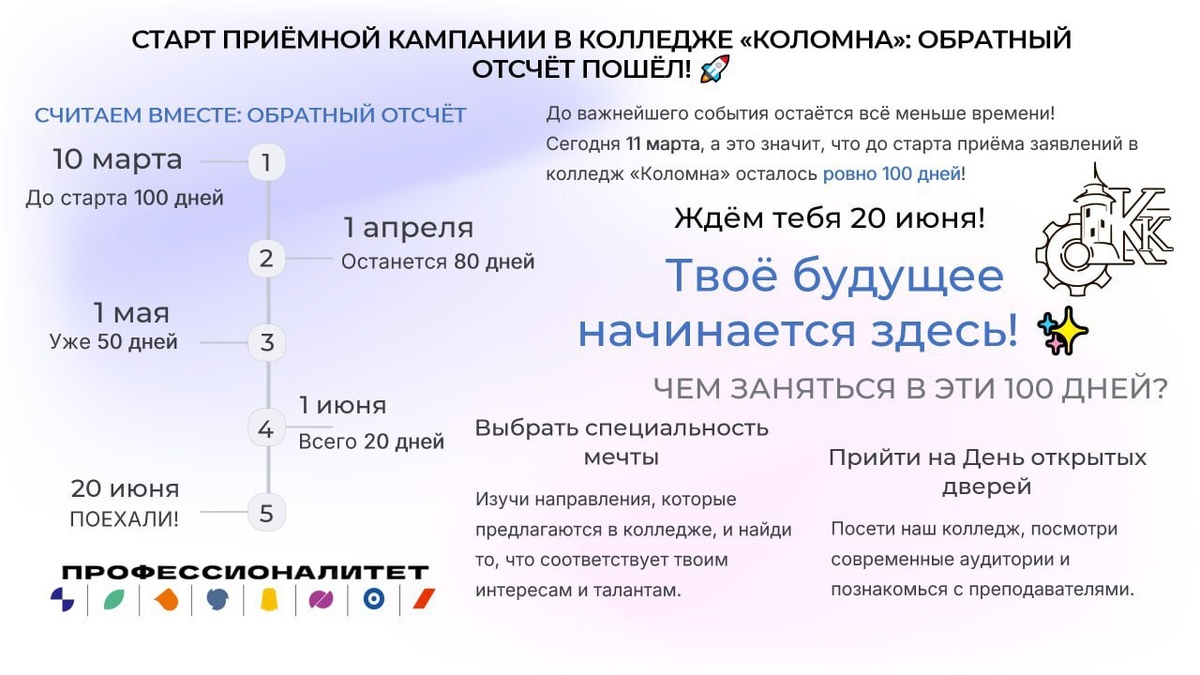 ! 🚀 Друзья, до важнейшего события остаётся всё меньше времени! ⏰ Сегодня 11 марта, а это значит, что до старта приёма заявлений в колледж «Коломна» осталось ровно 100 дней! 😱 Да-да, вы не ослышались: 20 июня в нашем колледже открывается приёмная комиссия. И этот момент приближается с каждым днём! 🔥 ❓ ЧЕМ ЗАНЯТЬСЯ В ЭТИ 100 ДНЕЙ? ✅ Выбрать специальность мечты ✅ Прийти на День открытых дверей ✅ Задать все вопросы приёмной комиссии ✅ И главное - настроиться на поступление! ⚡️ НЕ ТЕРЯЙ ВРЕМЕНИ! Пока ты думаешь - другие уже выбирают будущую профессию. У тебя есть 100 дней, чтобы определиться и сделать правильный выбор. А мы всегда рядом - поможем, подскажем, поддержим! 💪 Ждём тебя 20 июня! Твоё будущее начинается здесь! ✨ #КолледжКоломна #СПОмедиа