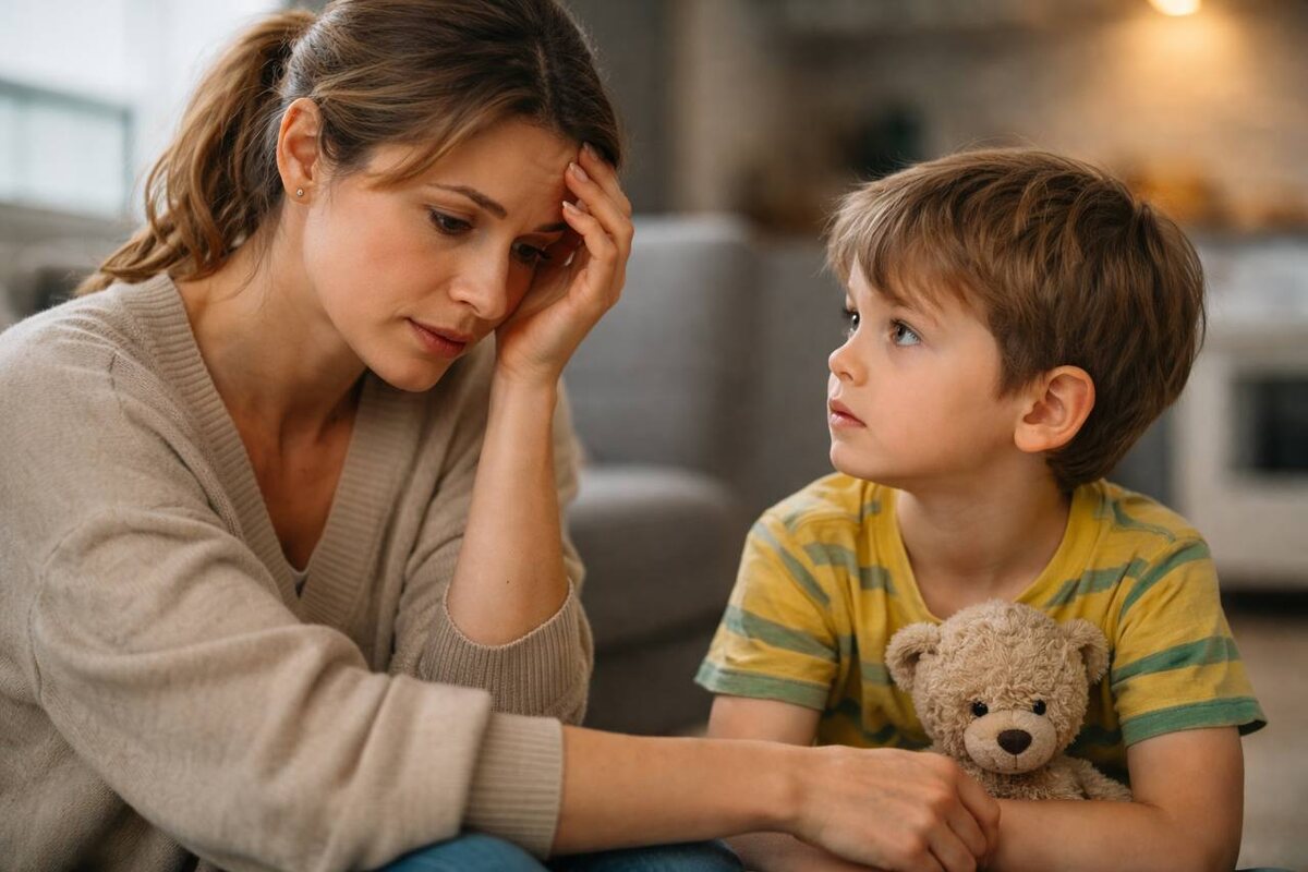 Ребёнок замечает не формулировки, а фон жизни. Он видит напряжённое лицо мамы. Слышит, как быстро она говорит. Чувствует, как меняется её голос в обычных ситуациях. Считывает, как она реагирует на его ошибки, опоздания, падения, неудачи, незапланированные мелочи.