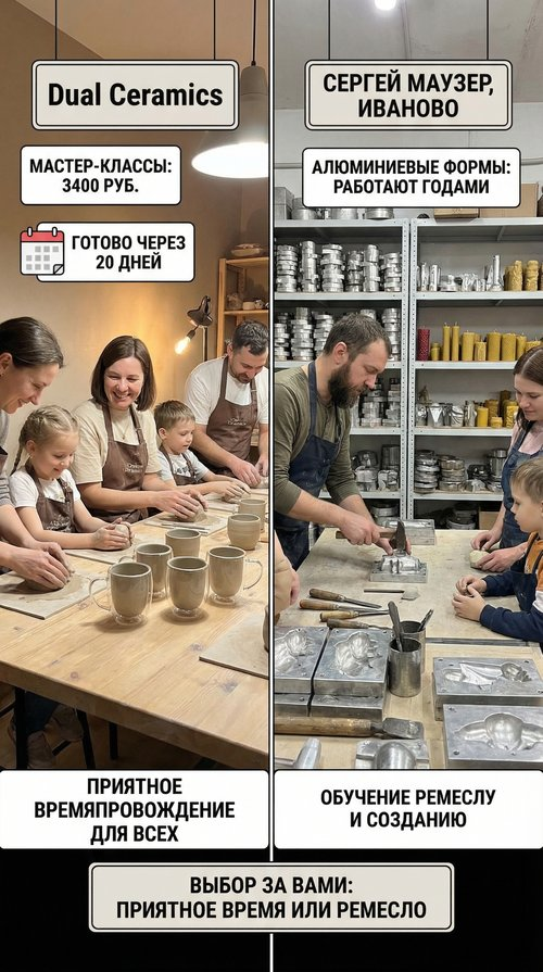 По вечерам мастерская принимает учеников. Группы по шесть-семь человек. Лепка руками, гончарный круг, формы для изразцов, роспись. Три урока по два часа для начинающих. Десять уроков — для тех, кто хочет максимум. Красиво. Людно. Дорого. Я позвонил Сергею Маузеру и прочитал ему это. — Десять уроков, — повторил он. — И чему научатся за десять уроков? — Лепить, наверное. — Лепить научатся. А дальше? Купят глину, будут лепить дома? Или каждый раз ходить в мастерскую? У меня проще. Я показываю один раз. Бесплатно. Если приедешь. И всё — ты умеешь. Дальше сам. Хоть каждый день лей. Три урока по два часа — это шесть часов с глиной. За шесть часов можно слепить несколько горшков. Кривых, но своих. Можно испачкаться, посмеяться, унести домой результат. Нормально. У Сергея Маузера обучение занимает два часа. За это время он показывает, как готовить воск, как натягивать фитиль, как заливать форму. Потом ученик делает свечу сам. С первого раза. Часто кривую, с пузырями, с косяками. Но свою. — Чер
