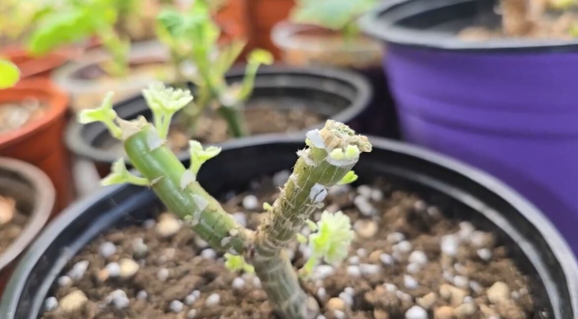 🌱 Срежьте с макушек здоровые черенки длиной 7–10 см. Удалите нижние листья, поставьте в воду или сразу воткните в легкий грунт. Через 2–3 недели у вас будут готовые молодые растения. Посадите по 2–3 черенка в один горшок — к лету получите шикарный куст. - 🌳 Глубокая обрезка (для оставшегося пня).