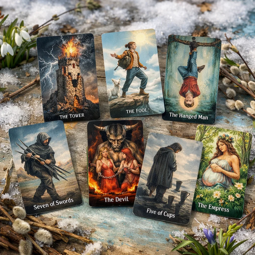 Карты расклада: Башня, Шут, Повешенный, Семёрка Мечей, Дьявол, Пятёрка Кубков, Императрица.