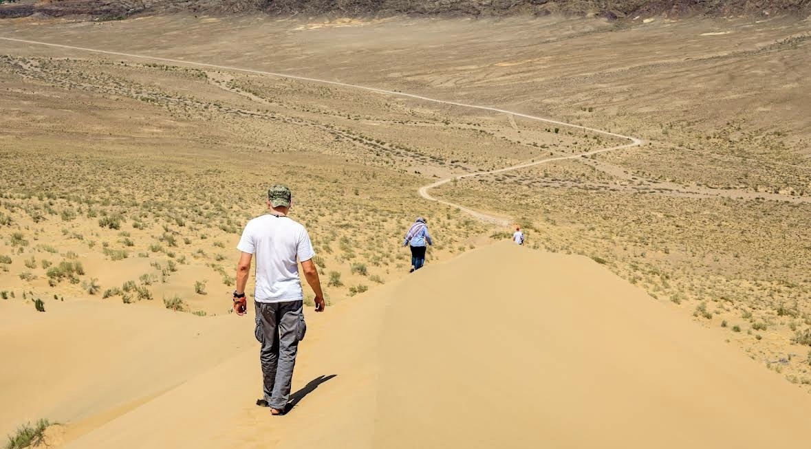 Поющий бархан, он же «самая громкая куча песка в Казахстане», он же природный сабвуфер степей. Этот гигантский песчаный монстр расположен в национальном парке Алтын-Эмель, между горами Большой и Малый Калкан. С виду — обычная дюна. Огромная, конечно: около 150 метров высотой и почти 3 километра длиной, но всё же просто песок. Однако у этого песка есть один маленький нюанс. Иногда он поёт. И нет, это не метафора и не рекламный текст туроператоров. Если коротко, Поющий бархан — это результат того, что ветер десятки тысяч лет упорно перетаскивал песок, пока не решил: «Ну всё, хватит, вот тут и будет склад». Когда-то давно в долине реки Или происходили постоянные песчаные миграции. Ветер гонял песок по степи как пыль по квартире студента. Но между двумя горными хребтами — Большим и Малым Калканом — образовалась природная ловушка. Песок, который туда заносило ветром, уже не мог выбраться обратно. В итоге происходило следующее: ветер приносил песок →