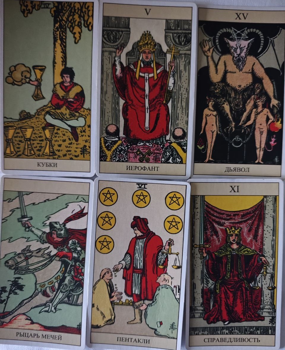Карты: Кубки 4, Иерофант, Дьявол, Рыцарь Мечей, Пентакли 6, Справедливость