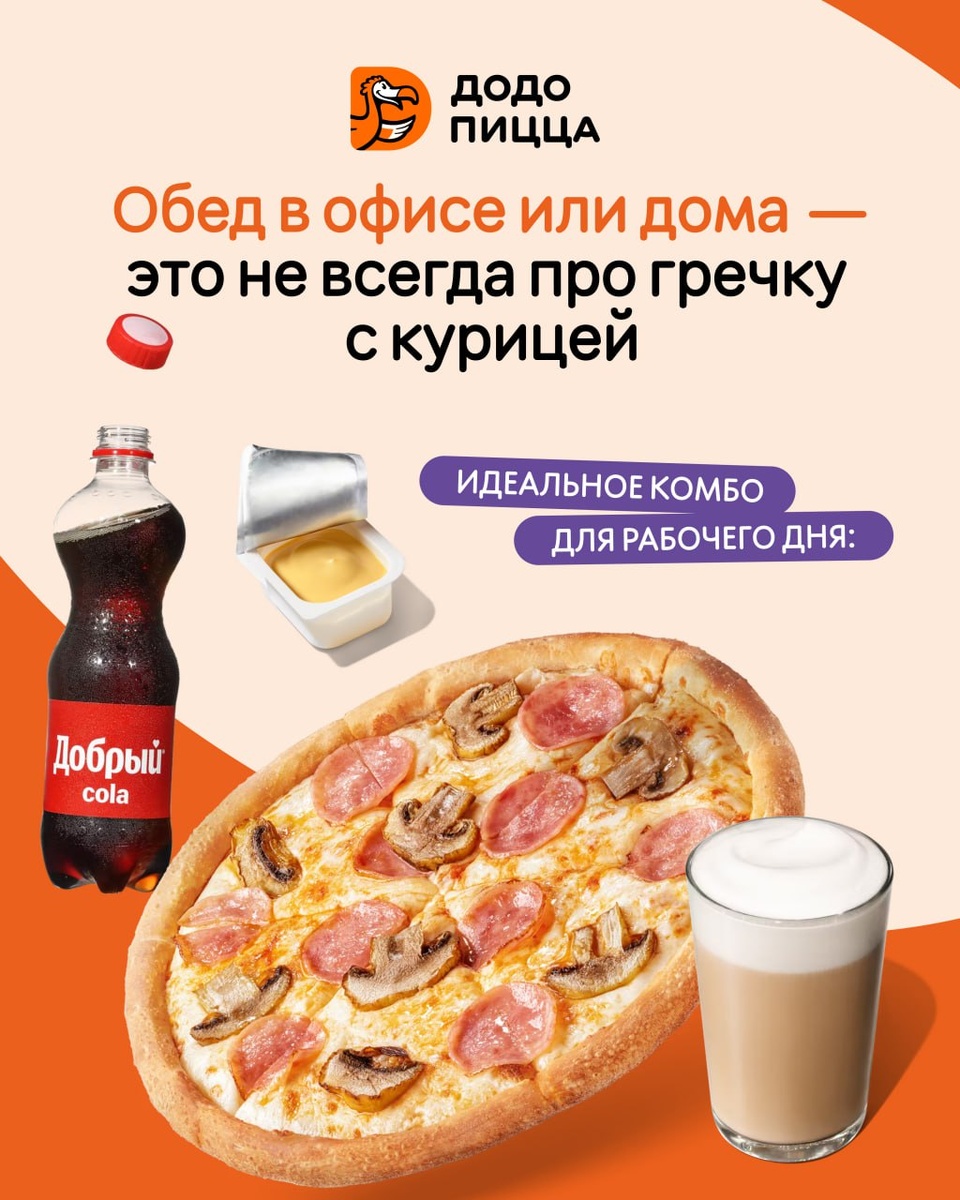Поэтому напоминаем про идеальное комбо для рабочего дня: ✅ Сытная пицца. ✅ Любимый напиток – холодный ледяной или горячий. ✅ Сырный соус — чтобы макать корочки. Доставим быстро, пока перерыв не закончился. А что вы обычно заказываете на обед?😉