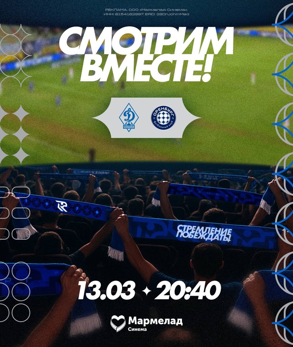 🥤 Приглашаем всех болельщиков 13 марта в 20:40 на совместный просмотр матча 💙⚽️ на большом экране в кинотеатре «Мармелад Синема». Вас ждёт увлекательная программа: автограф-сессия, фотографии и совместный просмотр матча с футболистами. Приобрести билеты можно по ссылке. У нас есть 30 билетов, которые мы хотим разыграть между вами. Напишите в комментариях слова мотивации для команды, которые бы вы сказали в раздевалке перед матчем. 30 лучших вариантов наградим билетами в кинотеатр! #ФКОренбург #ДинамоМХОренбург