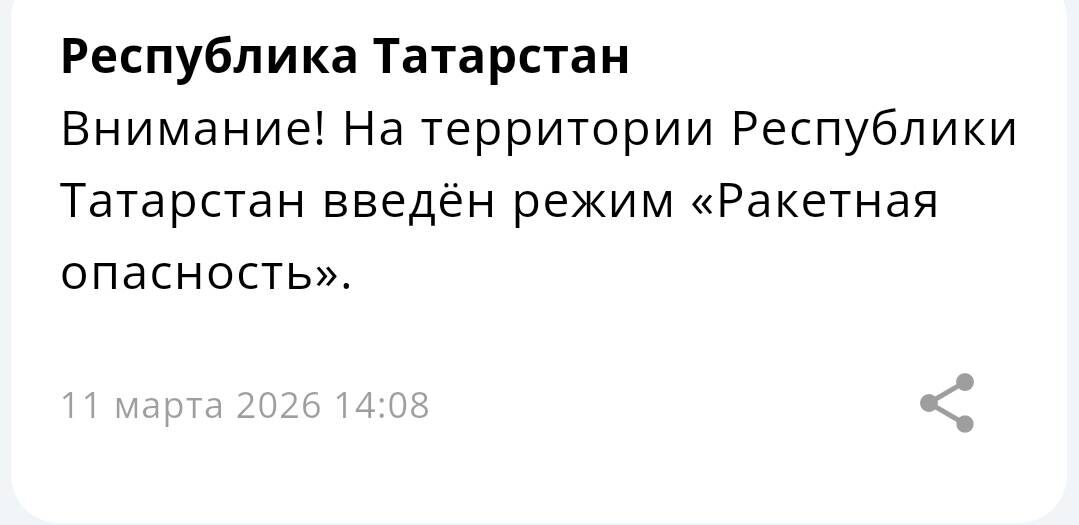 В Татарстане ввели режим ракетной опасности, сообщает официальное приложение МЧС.