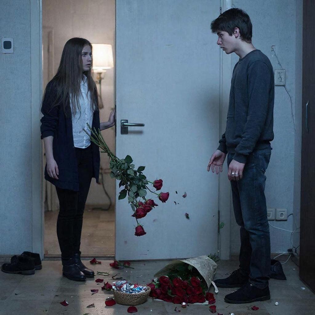 Но реальность оказалась сурова и жестока. Когда девушка открыла дверь, она взглянула на Андрея равнодушно и холодно, словно перед ней стоял чужой человек. Андрей протянул ей цветы, однако вместо ожидаемой благодарности девушка грубо вырвала букет из рук и резко бросила обратно в лицо Андрею, заявив: «Уходи отсюда немедленно, я тебя больше не люблю!» Парень замер от шока, пытаясь осмыслить происходящее. За пару секунд весь мир рухнул. Два года счастья, гармонии и верности превратились в пустоту одним мгновением.
