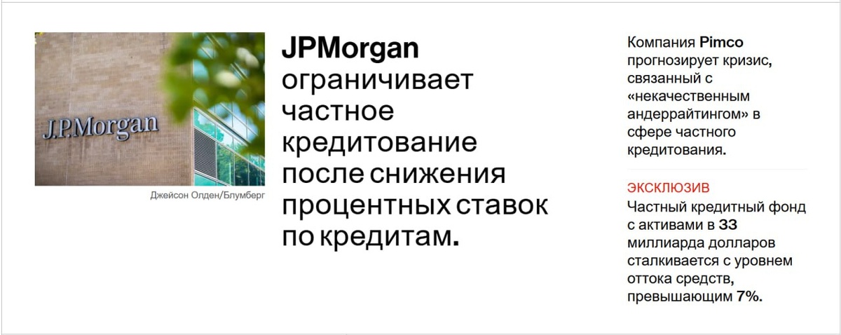 #ShadowBanking Проблемы нарастают: JPMorgan ограничивает кредитование частных кредитных фондов после снижения стоимости некоторых займов в их портфелях Обесцененные кредиты предоставлены компаниям-разработчикам ПО, которые являются одними из крупнейших заемщиков, стимулирующих рост рынка частного кредитования Cliffwater LLC стала последней частной кредитной фирмой, столкнувшейся с запросами на выкуп паев, превышающими 7% от средств ее флагманского фонда Аналогичные требования поступили от инвесторов фондов, управляемых BlackRock, Blackstone и Blue Owl Capital Pimco прогнозирует кризис, связанный с «некачественным андеррайтингом» в сфере частного кредитования: «Сейчас происходит переломный момент», — заявил Кристиан Штраке, президент компании по управлению активами на сумму 2,3 триллиона долларов, в подкасте 10 марта вместе с Грегори Холлом, главой подразделения глобального управления капиталом компании в США «Это не просто кризис доверия, это кризис крайне некачественного анде