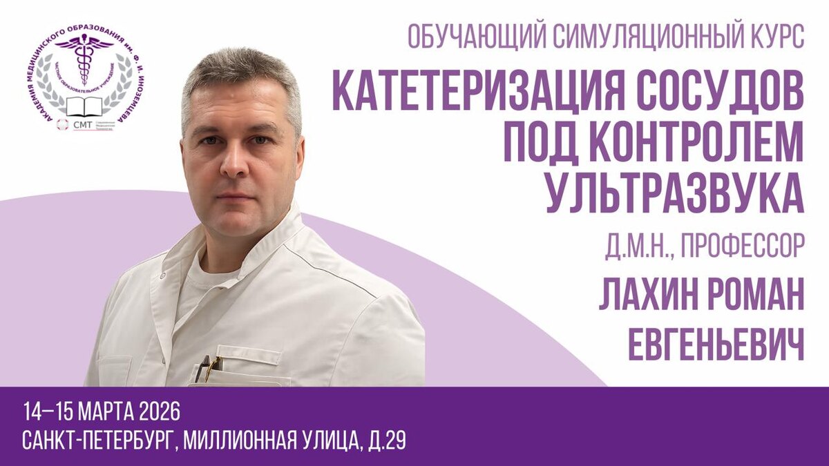 «Катетеризация сосудов под контролем ультразвука» 📅 14–15 марта 2026 | 📍 Санкт-Петербург Приглашаем врачей различных специальностей на практико-ориентированный симуляционный курс, посвящённый одной из ключевых инвазивных манипуляций в современной клинической практике — катетеризации сосудов под ультразвуковым контролем. Курс построен по принципу максимум практики: работа с соноанатомией на симулированном пациенте и отработка навыков на фантомах под руководством эксперта. Что входит в программу • принципы катетеризации сосудов под УЗ-контролем • пункция и катетеризация периферической вены • катетеризация внутренней яремной вены • катетеризация подключичной и подмышечной вен • катетеризация бедренной вены В результате обучения вы • уверенно освоите технику катетеризации под УЗ-контролем • снизите риски осложнений при выполнении процедур • научитесь учитывать индивидуальные анатомические особенности пациента • сможете применять навыки сразу в клинической практике Преподаватель ку