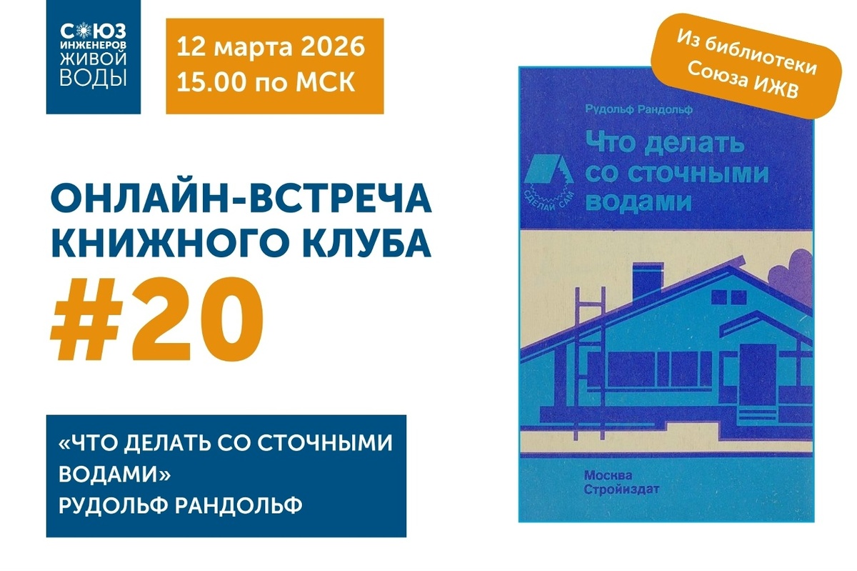 20 встреч с вами — возвращаемся к истокам 💙 12 марта в 15:00 (мск) встречаемся в 20-й раз на собрании Книжного клуба Союза ИЖВ. В честь юбилея вспоминаем самый первый формат. Когда-то наш Книжный клуб задумывался просто: выбираем книгу, читаем пару недель, встречаемся и обсуждаем. Без сложных планов, просто живой разговор про воду и смыслы. Именно так мы и сделаем в этот раз. Книгу тоже подобрали несложную и в чем-то даже уютную: "Что делать со сточными водами" Рандольфа Рудольфа. Не сухой учебник и не зубодробительный технический трактат. Скорее любопытствующий разговор о том, что скрыто в стоках помимо очевидного, как их превращать в ресурс и почему это важно для каждого из нас. Научно-популярная книга, которую поймут и профи, и те, кто просто хочет разбираться в том, что происходит с водой вокруг. На встрече послушаем обзор по главам, обсудим, насколько книга актуальна сегодня, поделимся личными впечатлениями и рабочими историями, вместе поищем ответы на вопросы, которые вызв