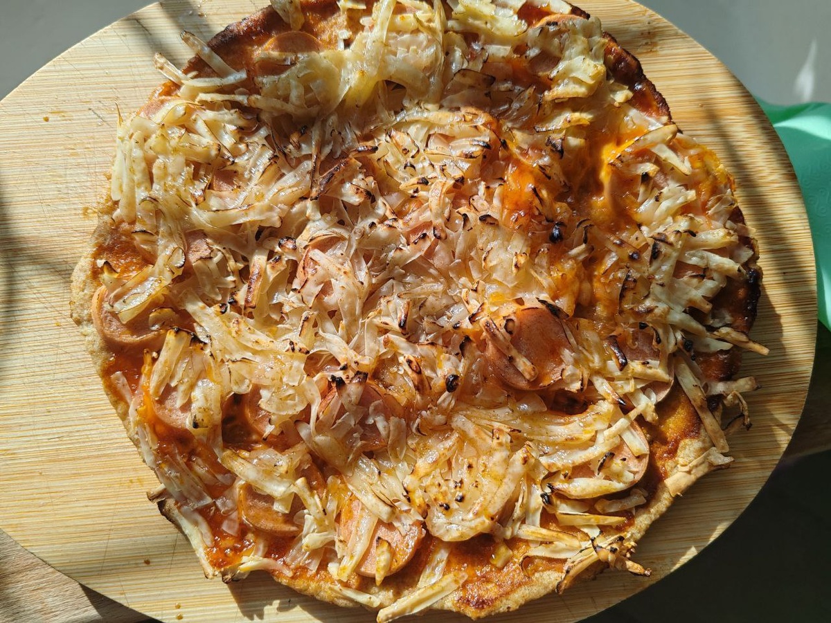🌿🥑🔥 ▌ 🧂 Ингредиенты: * Оливковое масло – 10 г ☝️ * Белая льняная мука – 10 г ✨ * Вода – 50 мл 💧 * Миндальная мука – 30 г 🌰 * Разрыхлитель – ½ ч.л. 🎯 * Соль – щепотка 🤩 * Постный майонез – 1 ст.л. 🐷 * Кетчуп – 1 ст.л. 🍅 * Веганская сосиска – 50 г 🚀 * Соевый сыр пармезан – 50 г 🧀 ▌ 📖 Инструкция по приготовлению: 1. Смешайте все ингредиенты и сделайте тесто. 🍰 2. Руками на тефлоновом коврике аккуратно разомните тесто в лепёшку. 👋👟 3. Лепёшку жарим на сухой сковороде на медленном огне 😊 4. Обжарьте лепёшку с одной стороны, переверните. 🔙 5. Намажьте майонезом и кетчупом. 🍅🐷 6. Разложите начинку и посыпьте сыром. 🧀 7. Чтобы не повредить лепёшку при укладке на сковородку, воспользуйтесь хитростью: положите её лепёшкой вниз, не снимая тефлонового коврика, и только когда лепёшка немного прожарится, аккуратно снимите коврик. 🛢️ 8. Накройте крышкой и доведите до готовности. 🫖 Приятного аппетита! 🍽️
