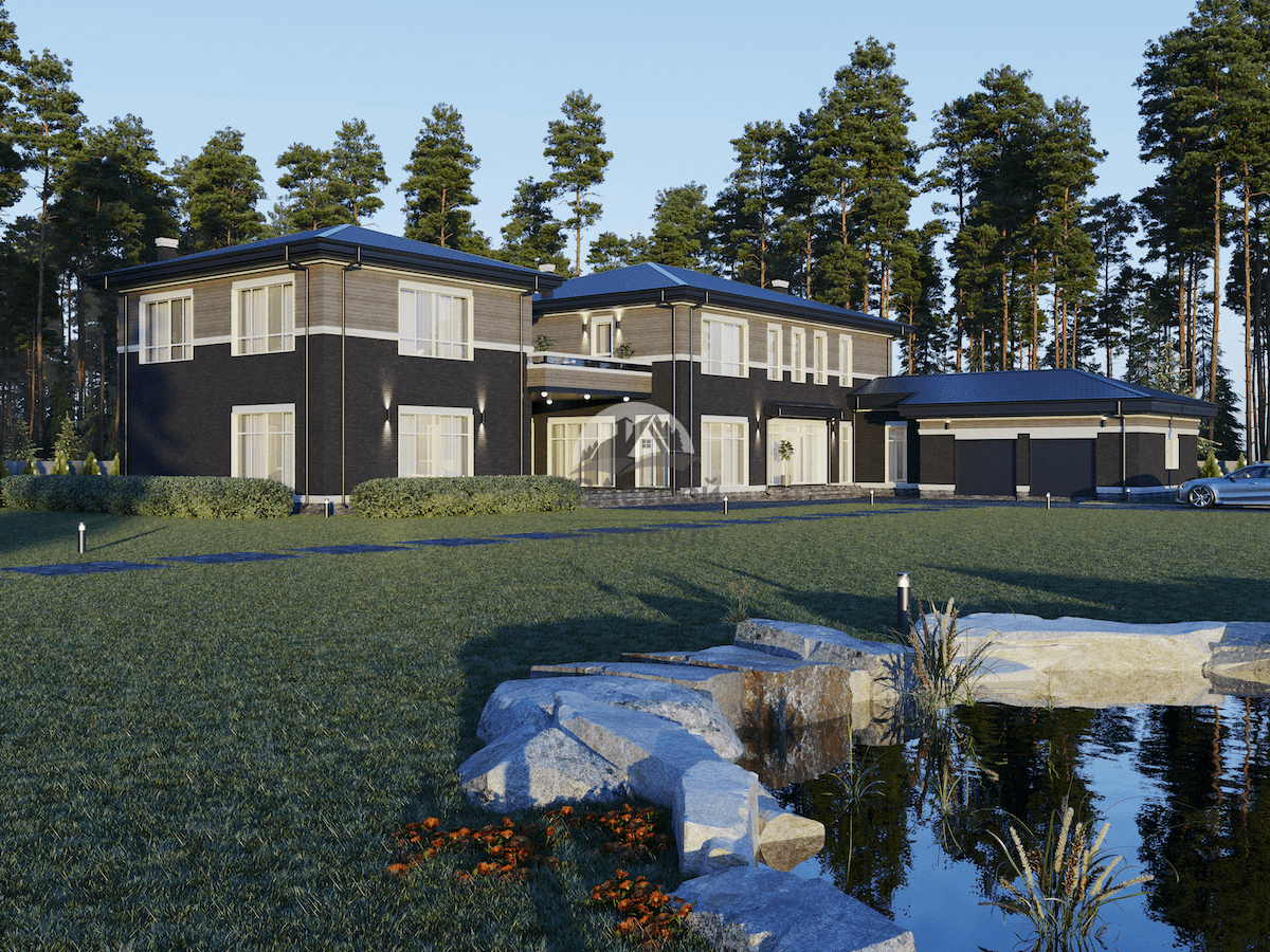 Номер проекта: 107-34 (П86) Разделы проекта: Архитектурный и Конструктивный разделы Узнать о проекте больше можно на сайте evastroy.ru или по телефону +7 (495) 175-30-40 Обширный, оригинально спроектированный коттедж общей площадью 575 м2 отлично подходит тем, кто устал от шумного мегаполиса и делает выбор в пользу комфортной жизни вне городской черты. Также это прекрасный вариант для загородного дома отдыха. Созданный в европейском стиле объект состоит из нескольких взаимосвязанных модулей. В нем можно выделить: жилой корпус (2 этажа): 6 спален, гостиная, кухня, кабинет, 5 санузлов, 3 гардеробные, 2 кладовые, постирочная, свободное помещение, тамбур, холлы; досуговый корпус (2 этажа): сауна, хамам, комната отдыха, бильярдная; связующий модуль (1 этаж): барбекю-зона, крытая и открытая террасы; хозблок (1 этаж): двухместный гараж, бойлерная. Главный корпус. На первом этаже, наряду с гостиной и кухней-столовой, находятся две спальни, санузел, ванная, постирочная. А также просторный светл