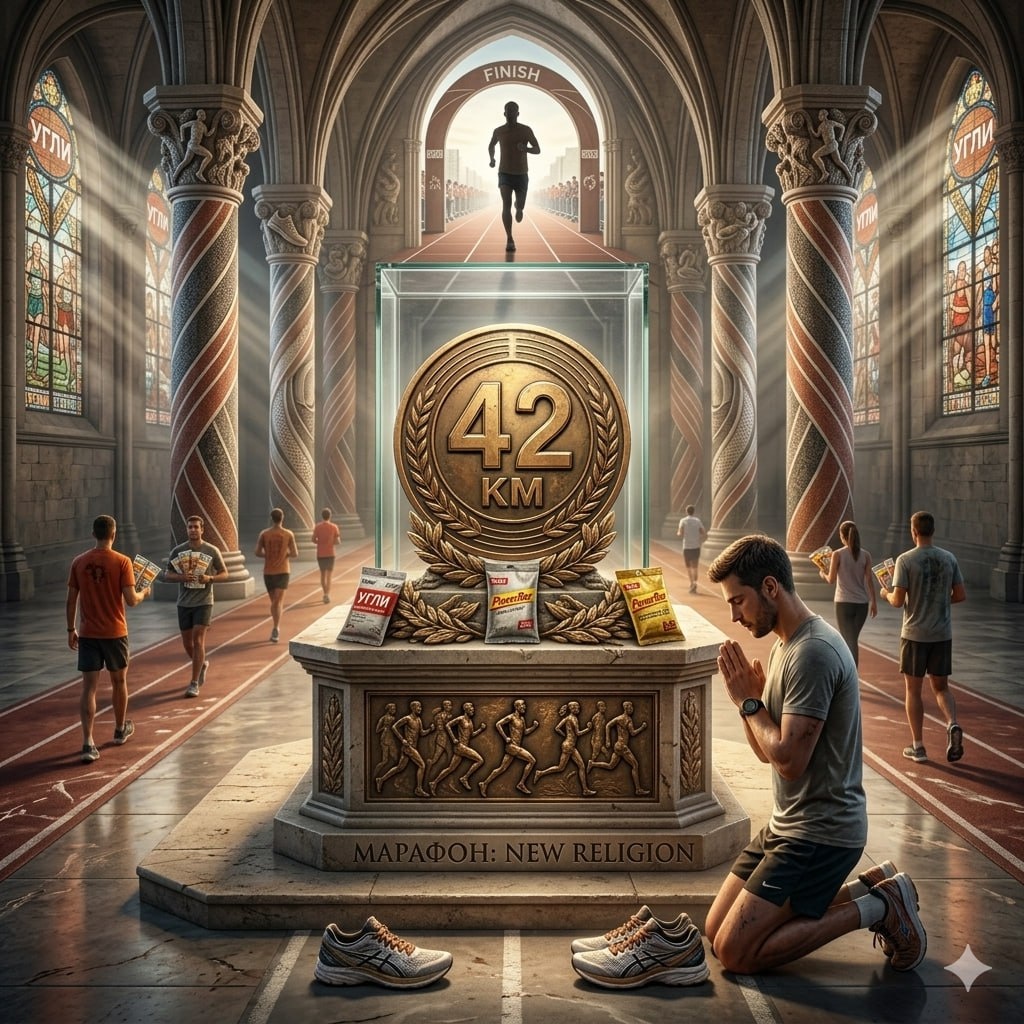 По-настоящему. Почти религиозно. Марафон - это не просто дистанция 42,2 км. Это ритуал. Какую жертву ты ему принесёшь - столько он тебе и позволит. Мы жертвуем временем. Сном. Силой. Комфортом. Ранние подъёмы, длинные тренировки, отказ от вечеринок, километры в любую погоду - всё это часть культа. Внутри человека есть место для религии и каждый заполняет её чем может. Кто-то - верой. Кто-то - работой. Кто-то -детьми и семьей. А кто-то - марафоном. Поэтому мы совершаем паломничества на старты. Покупаем слоты за полгода. Готовим экипировку как священные артефакты. Украшаем себя медалями. Скупка слотов, кроссовок - это религиозный фанатизм. С бегунами невозможно разговаривать, они проповедники, миссионеры. Все темы вокруг ПАНО, пульса, МПК, кроссовок, стартов. Бегуны агитируют всех бегать. Организаторы стартов - почти служители культа. А стартовый взнос - наша десятина. Старые религии себя исчерпали, а новых нет. Марафон это новая религия и фетиш. Мы выполняем ритуалы: длинные пр