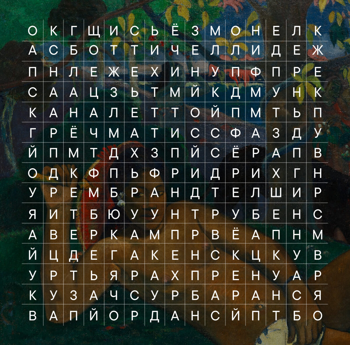 Мы подготовили для вас новую игру. Может быть, этот досуг поможет вам немного отдохнуть, отпустить серьёзные мысли и расслабиться. Как это работает? В таблице в ячейках находятся буквы. Некоторые из этих букв складываются в слова — в имена и фамилии художников, работы которых представлены в Пушкинском музее. Если вы нашли все 15 художников — ваши познания впечатляют даже нас! Если больше 10 — может, вы преподаёте историю искусств? Если больше 5 — значит, вы часто посещаете Пушкинский музей. Обратите внимание: слова написаны только слева-направо и только по горизонтали. Имя художника зашифровано в каждой строчке. Удачи вам!